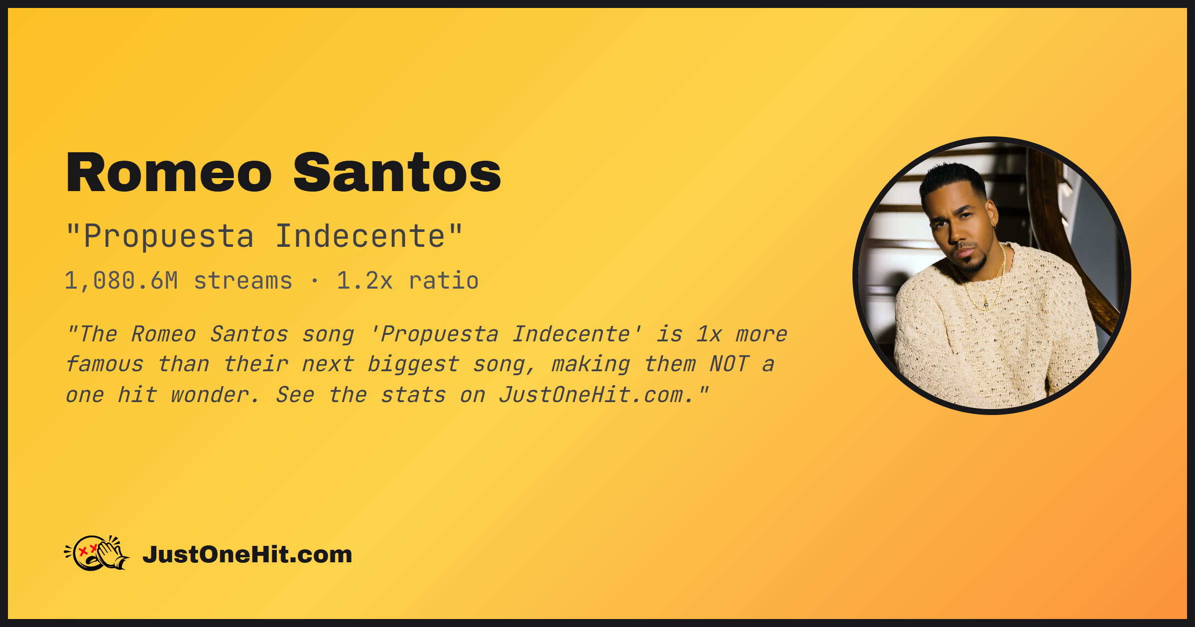 "The Romeo Santos song 'Propuesta Indecente' is 1x more famous than their next biggest song, making them NOT a one hit wonder. See the stats on JustOneHit.com."