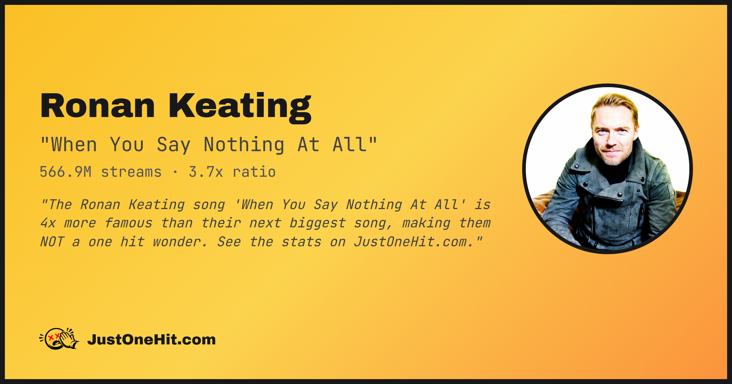 "The Ronan Keating song 'When You Say Nothing At All' is 4x more famous than their next biggest song, making them NOT a one hit wonder. See the stats on JustOneHit.com."