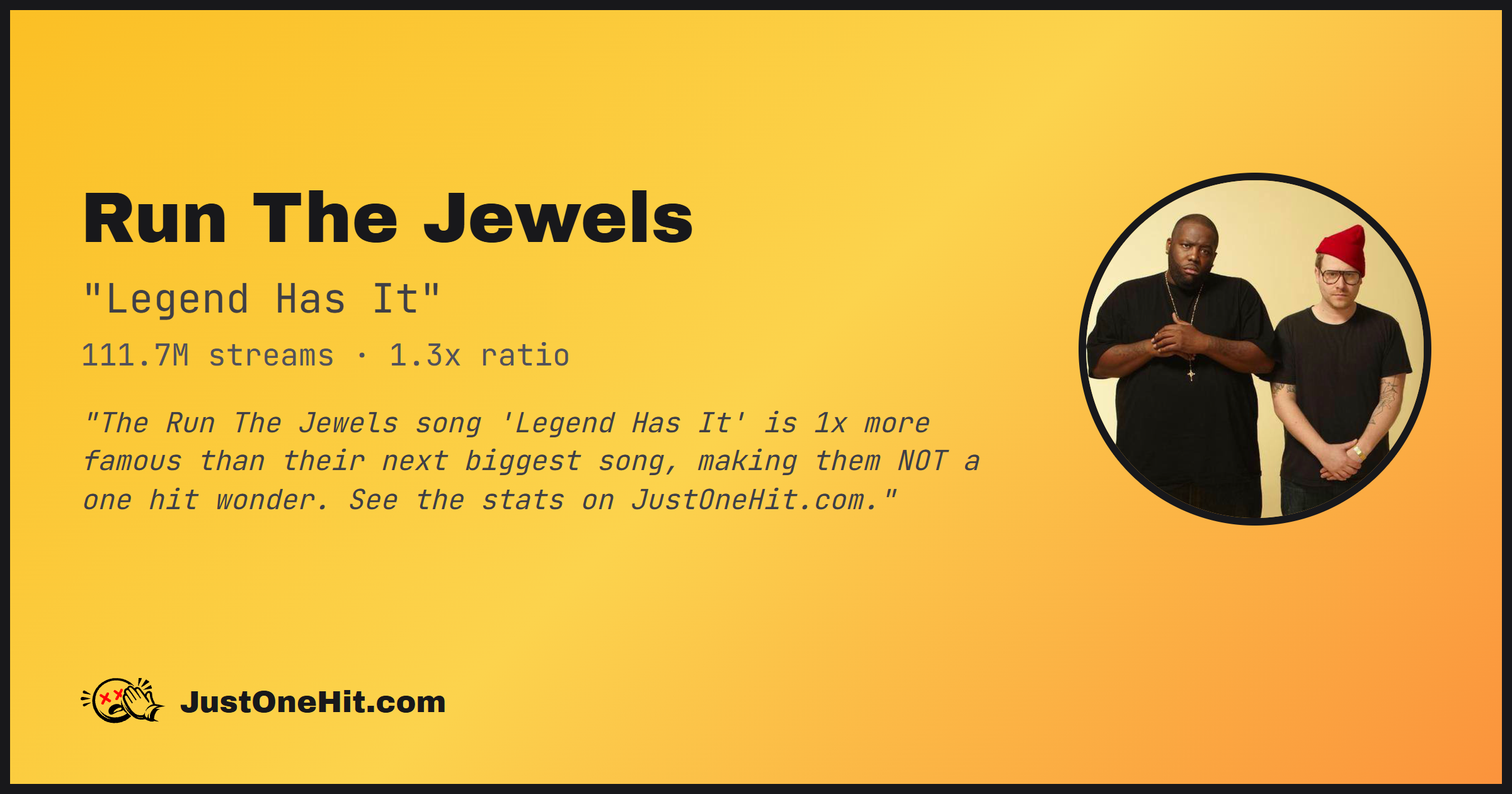 "The Run The Jewels song 'Legend Has It' is 1x more famous than their next biggest song, making them NOT a one hit wonder. See the stats on JustOneHit.com."