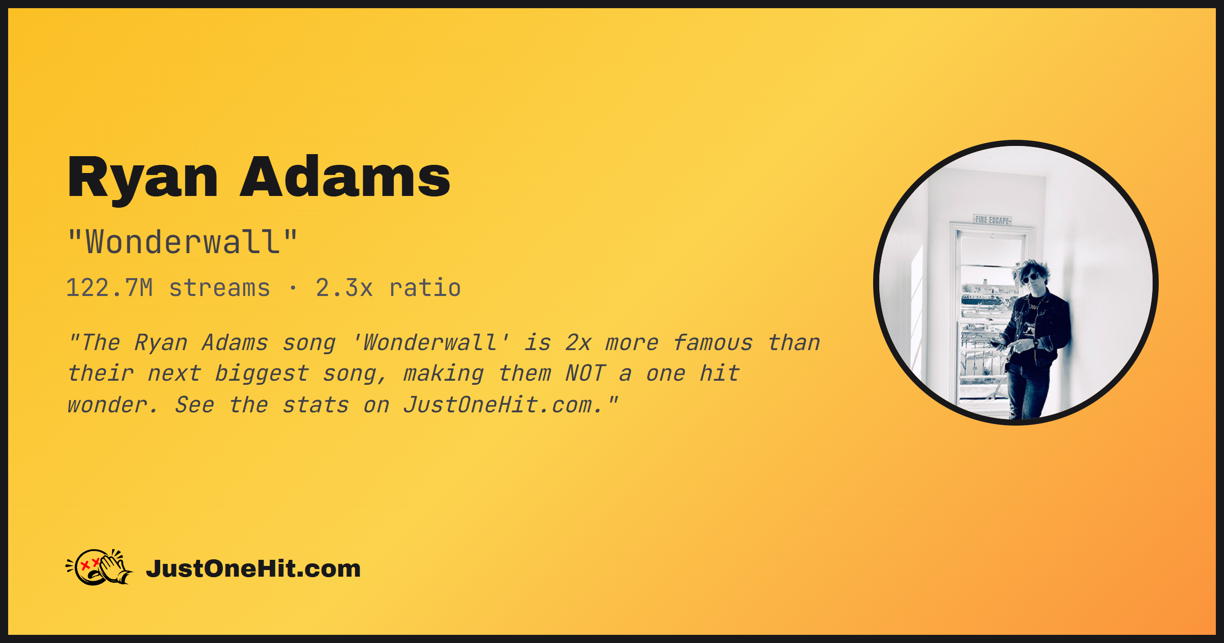 "The Ryan Adams song 'Wonderwall' is 2x more famous than their next biggest song, making them NOT a one hit wonder. See the stats on JustOneHit.com."