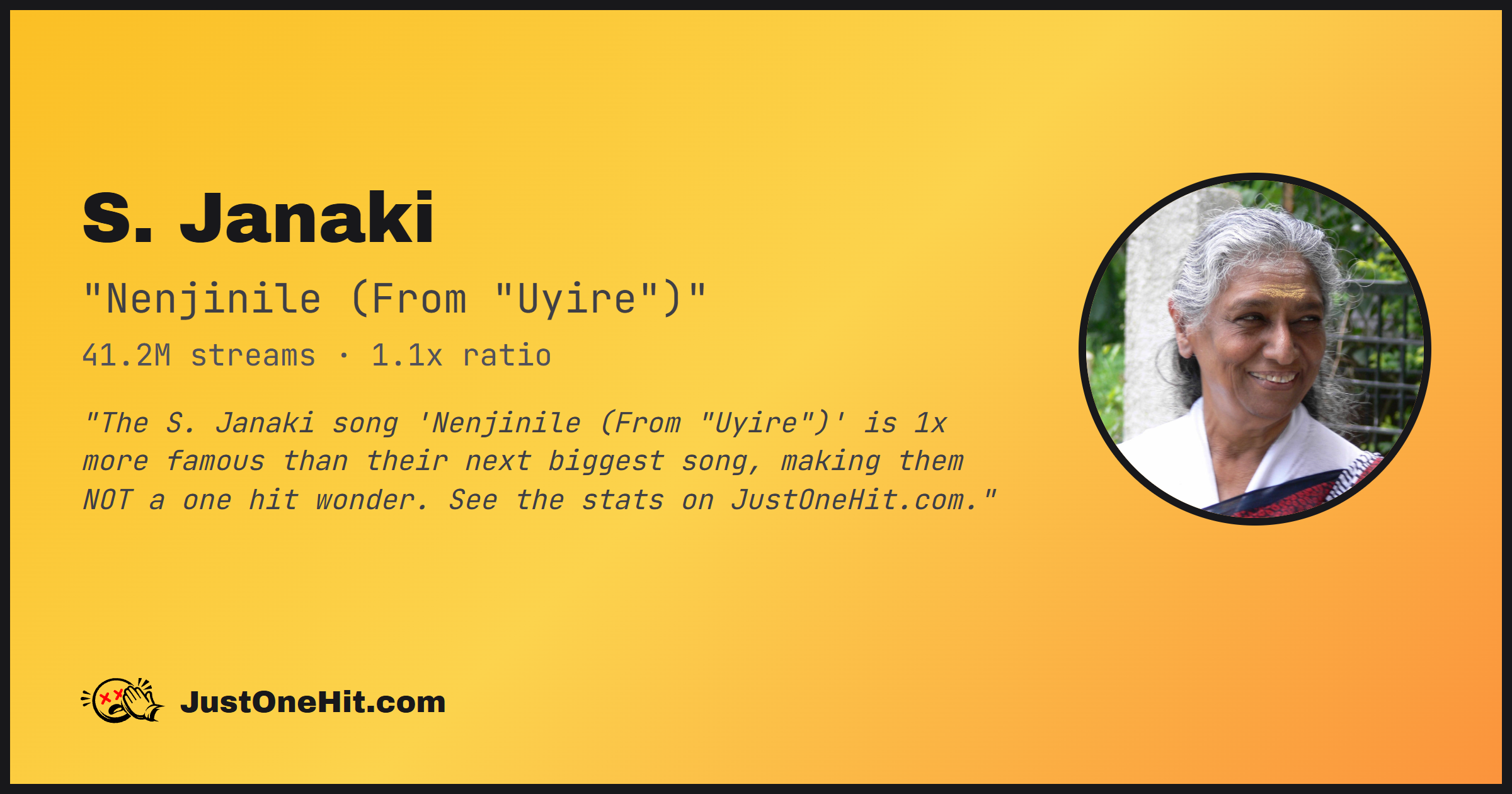 "The S. Janaki song 'Inji Idupazhaga (From "Devar Magan")' is 1x more famous than their next biggest song, making them NOT a one hit wonder. See the stats on JustOneHit.com."