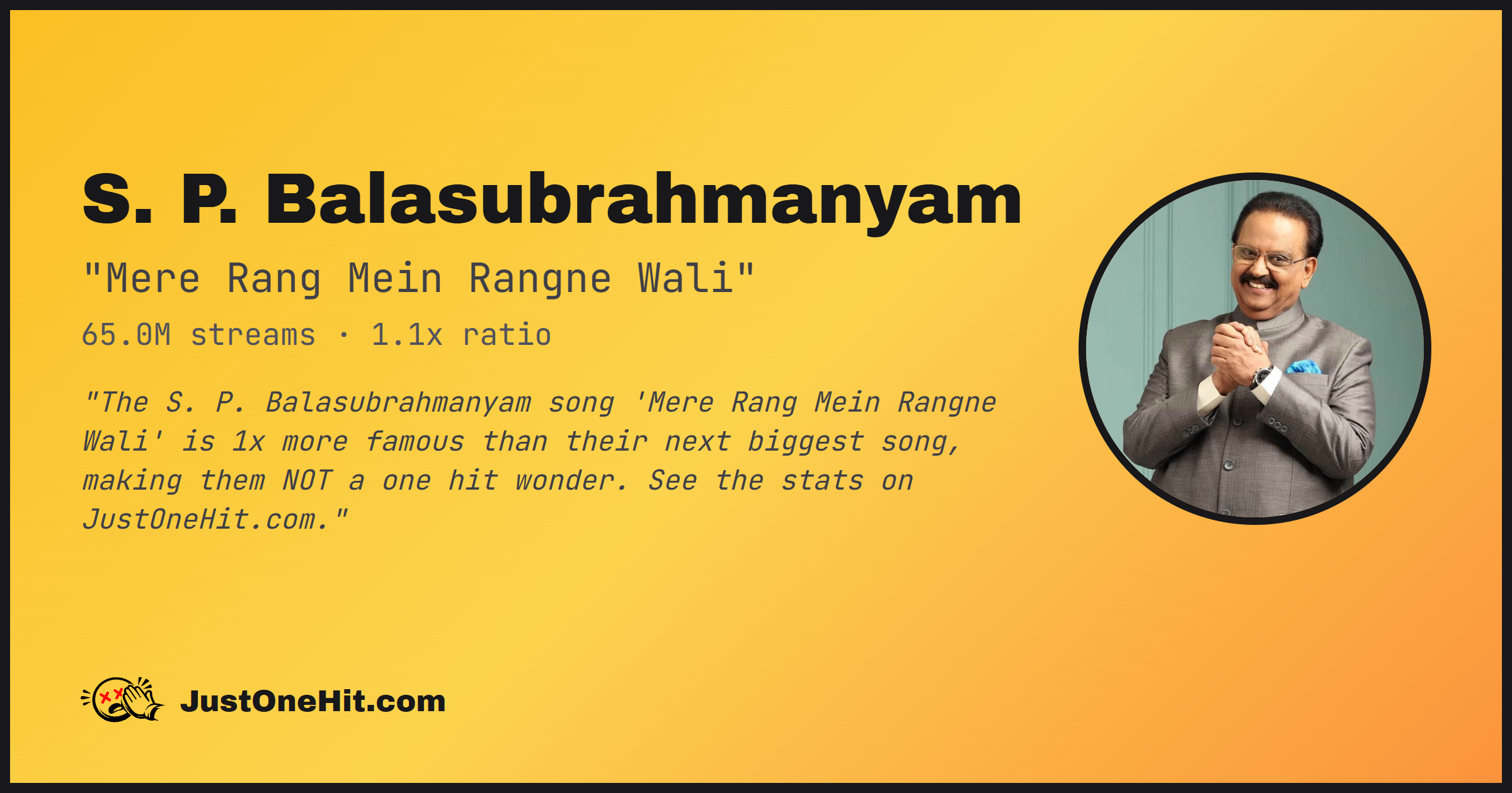 "The S. P. Balasubrahmanyam song 'Mere Rang Mein Rangne Wali' is 1x more famous than their next biggest song, making them NOT a one hit wonder. See the stats on JustOneHit.com."