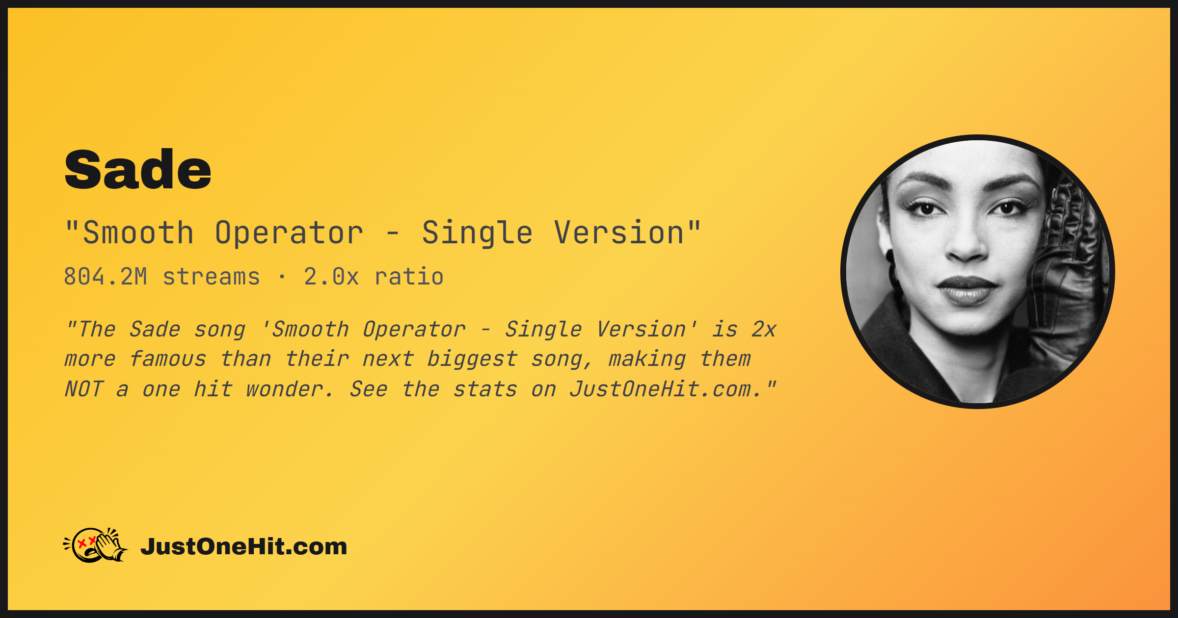 "The Sade song 'Smooth Operator - Single Version' is 2x more famous than their next biggest song, making them NOT a one hit wonder. See the stats on JustOneHit.com."
