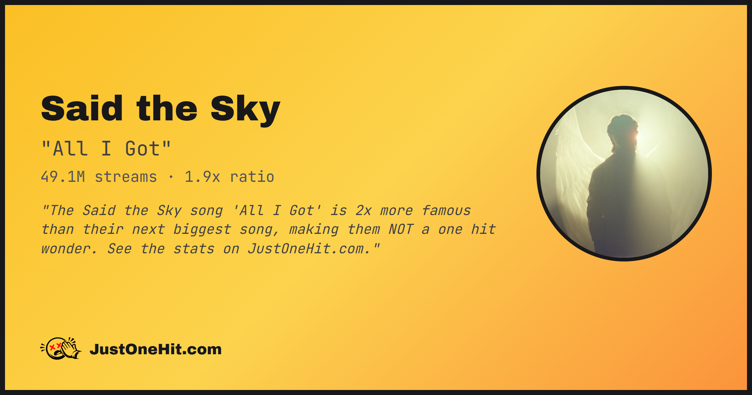"The Said the Sky song 'All I Got' is 2x more famous than their next biggest song, making them NOT a one hit wonder. See the stats on JustOneHit.com."