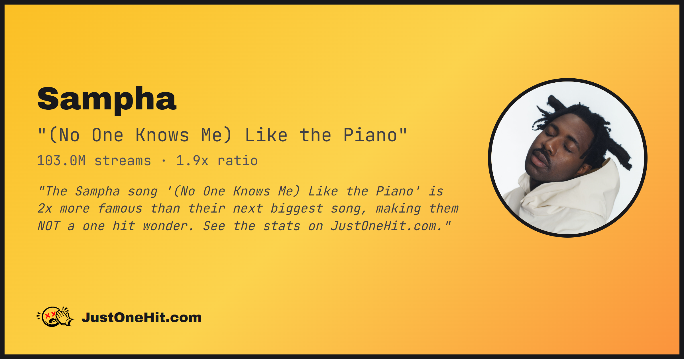 "The Sampha song '(No One Knows Me) Like the Piano' is 2x more famous than their next biggest song, making them NOT a one hit wonder. See the stats on JustOneHit.com."