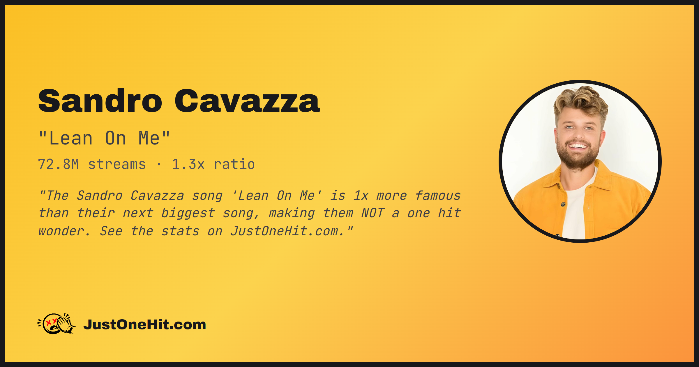 "The Sandro Cavazza song 'Lean On Me' is 1x more famous than their next biggest song, making them NOT a one hit wonder. See the stats on JustOneHit.com."
