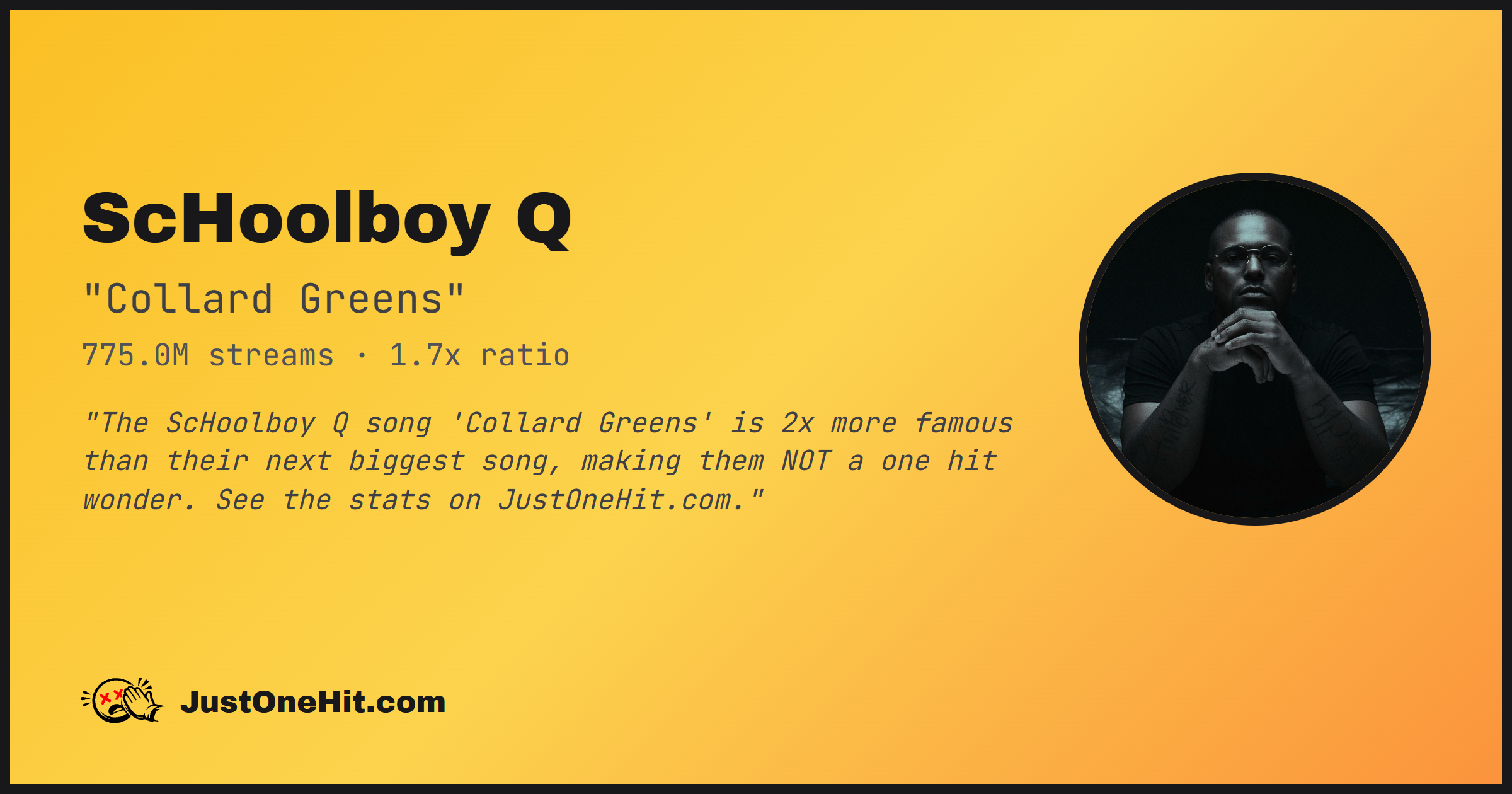 "The ScHoolboy Q song 'Collard Greens' is 2x more famous than their next biggest song, making them NOT a one hit wonder. See the stats on JustOneHit.com."