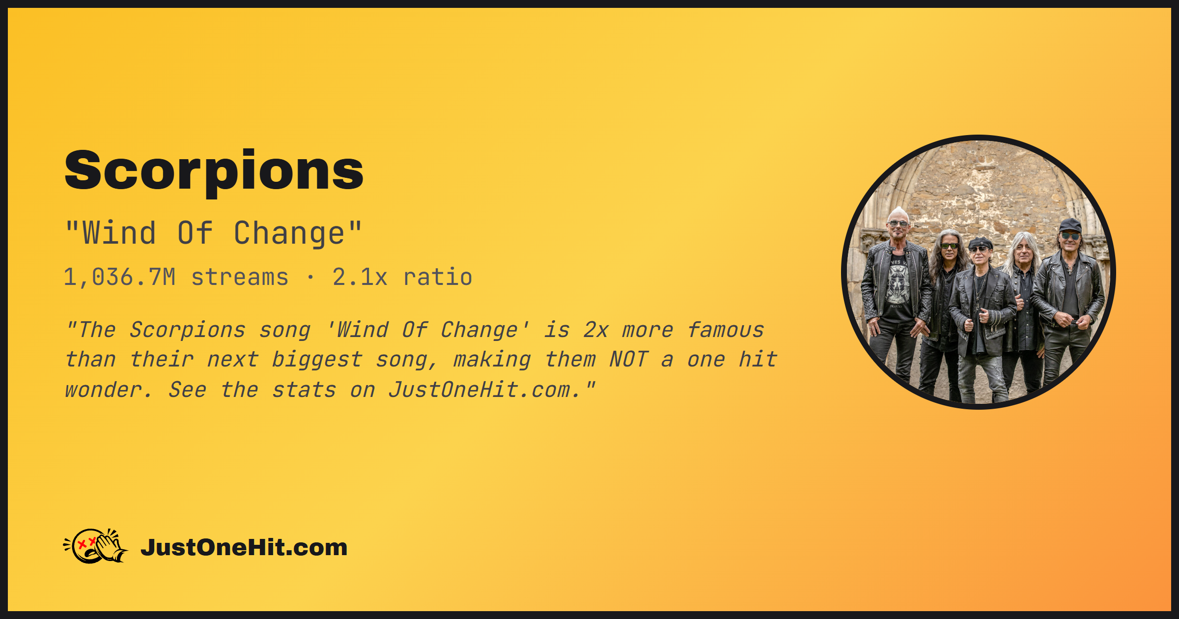 "The Scorpions song 'Wind Of Change' is 2x more famous than their next biggest song, making them NOT a one hit wonder. See the stats on JustOneHit.com."