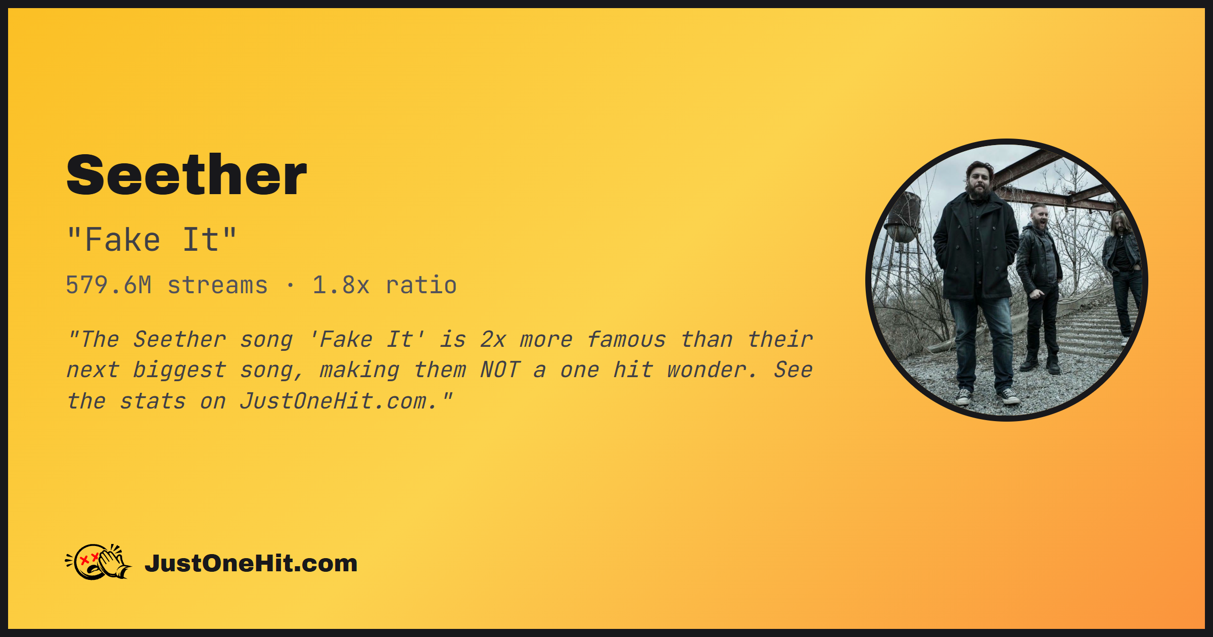 "The Seether song 'Fake It' is 2x more famous than their next biggest song, making them NOT a one hit wonder. See the stats on JustOneHit.com."
