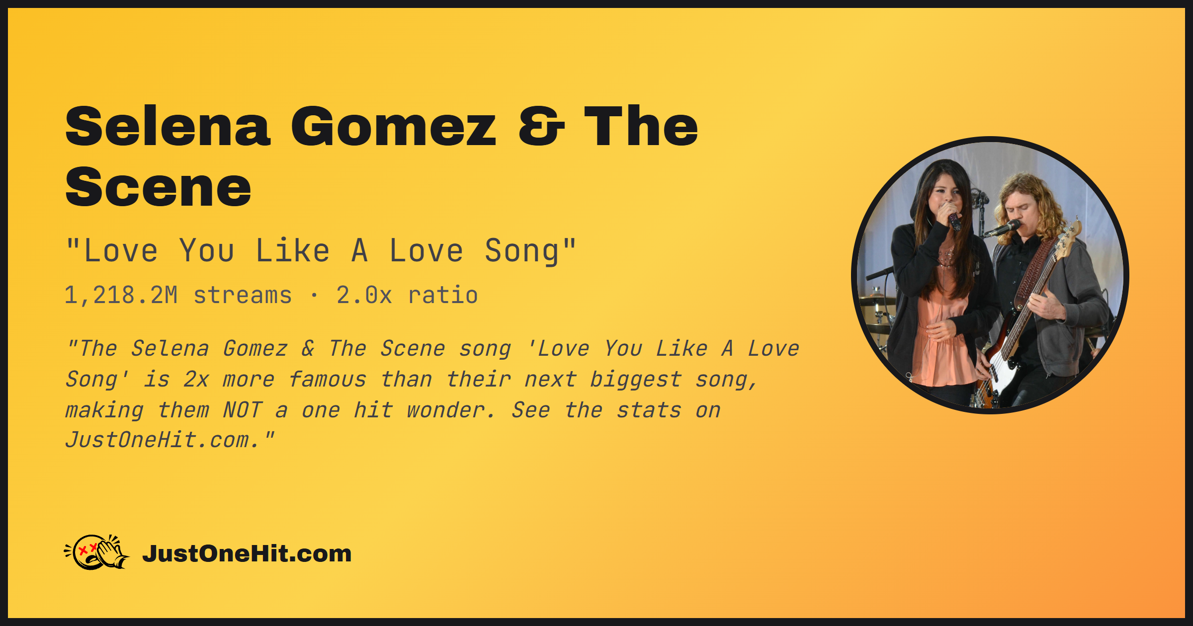 "The Selena Gomez & The Scene song 'Love You Like A Love Song' is 2x more famous than their next biggest song, making them NOT a one hit wonder. See the stats on JustOneHit.com."