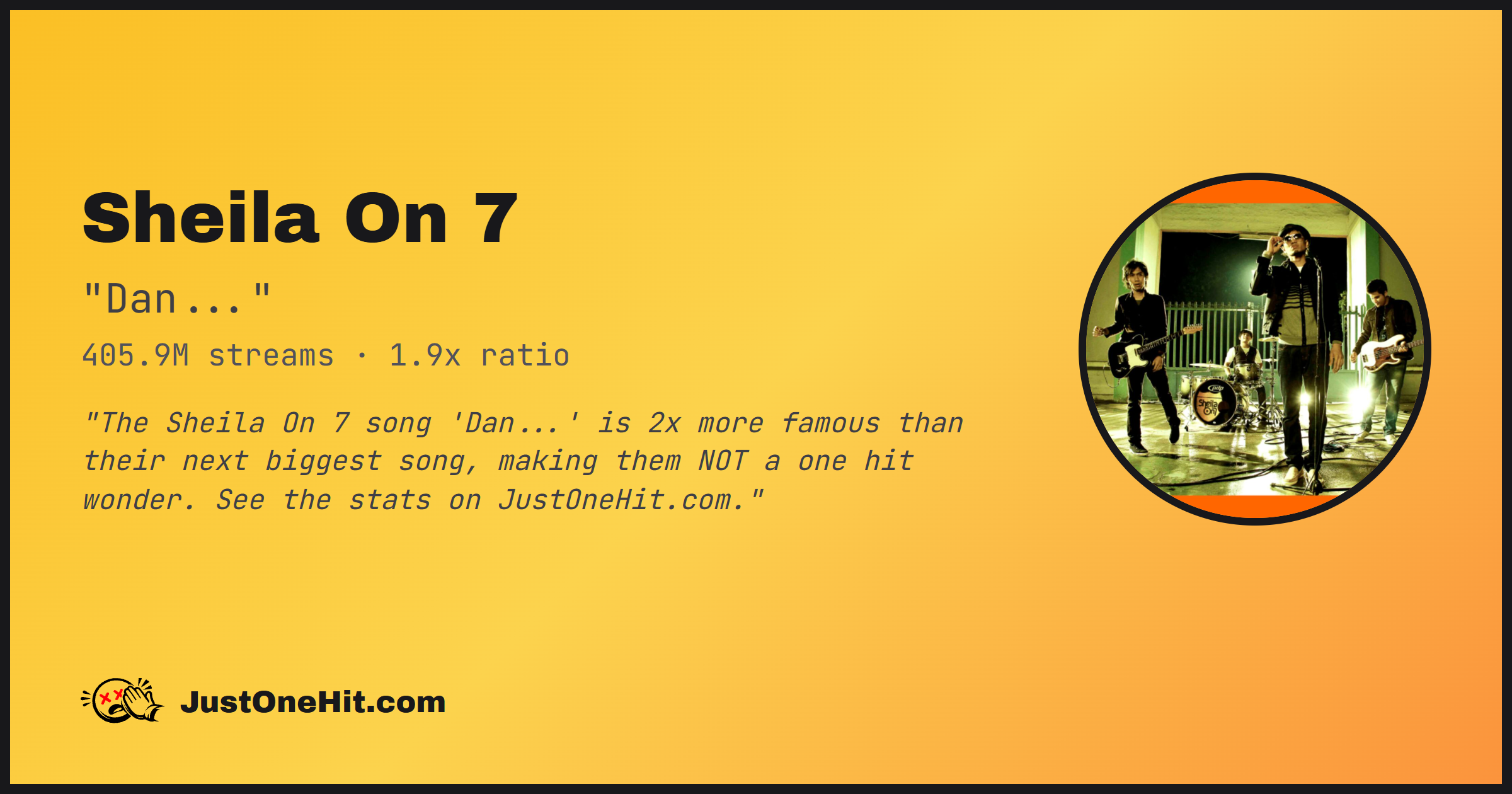 "The Sheila On 7 song 'Dan...' is 2x more famous than their next biggest song, making them NOT a one hit wonder. See the stats on JustOneHit.com."