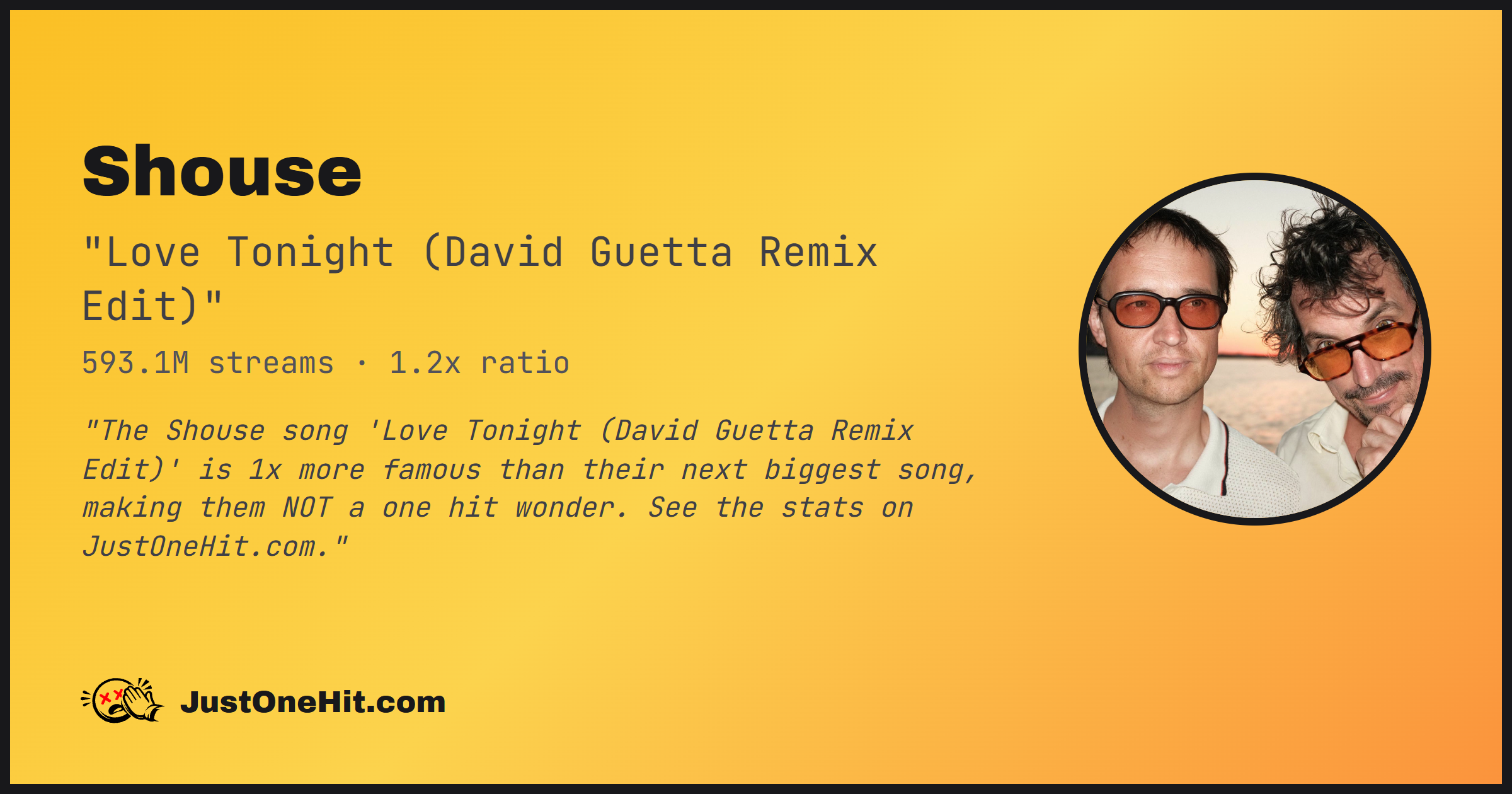 "The Shouse song 'Love Tonight (David Guetta Remix Edit)' is 1x more famous than their next biggest song, making them NOT a one hit wonder. See the stats on JustOneHit.com."