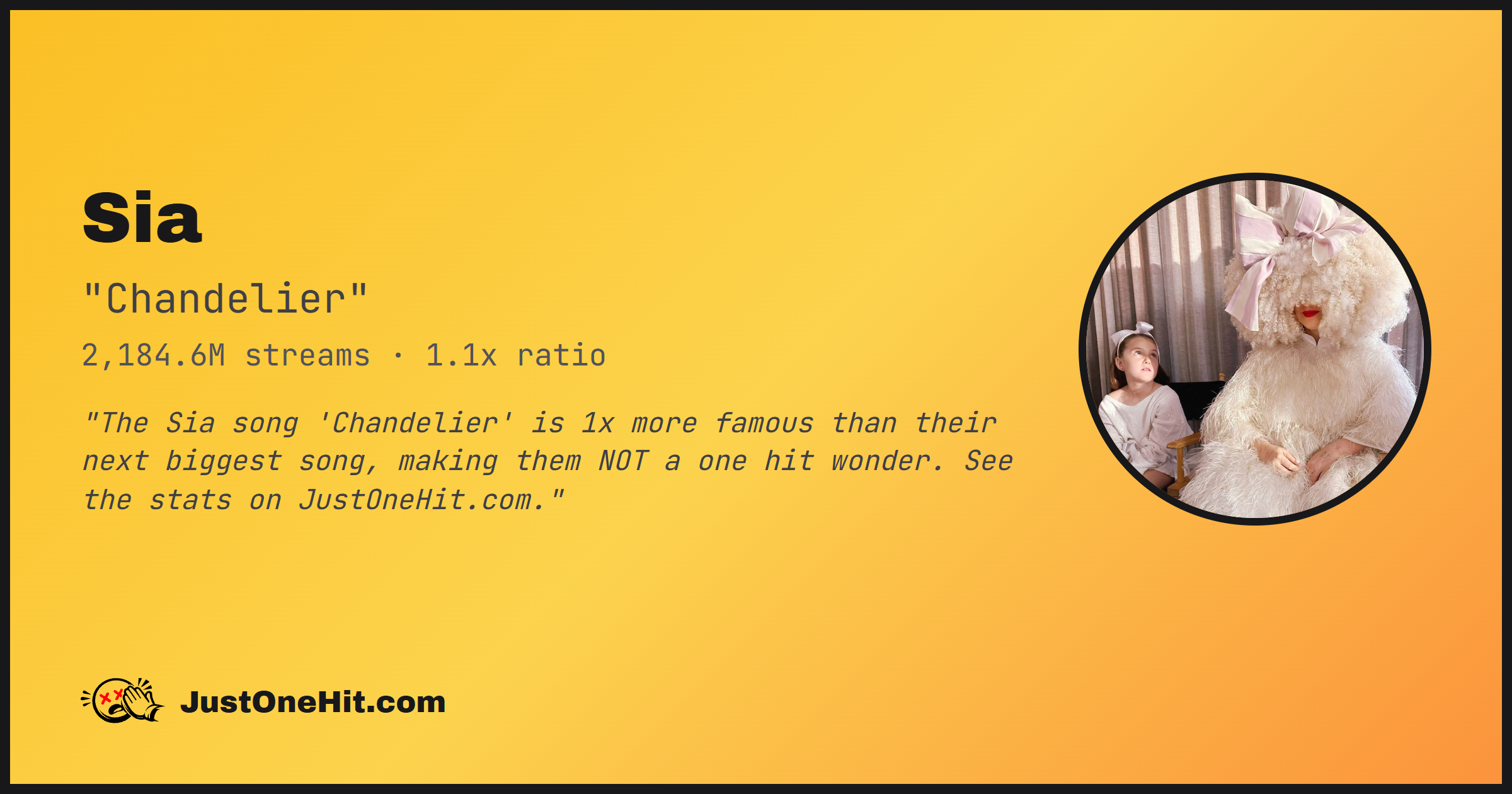 "The Sia song 'Chandelier' is 1x more famous than their next biggest song, making them NOT a one hit wonder. See the stats on JustOneHit.com."