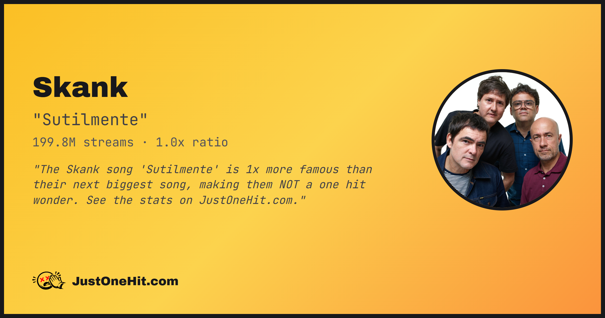 "The Skank song 'Sutilmente' is 1x more famous than their next biggest song, making them NOT a one hit wonder. See the stats on JustOneHit.com."