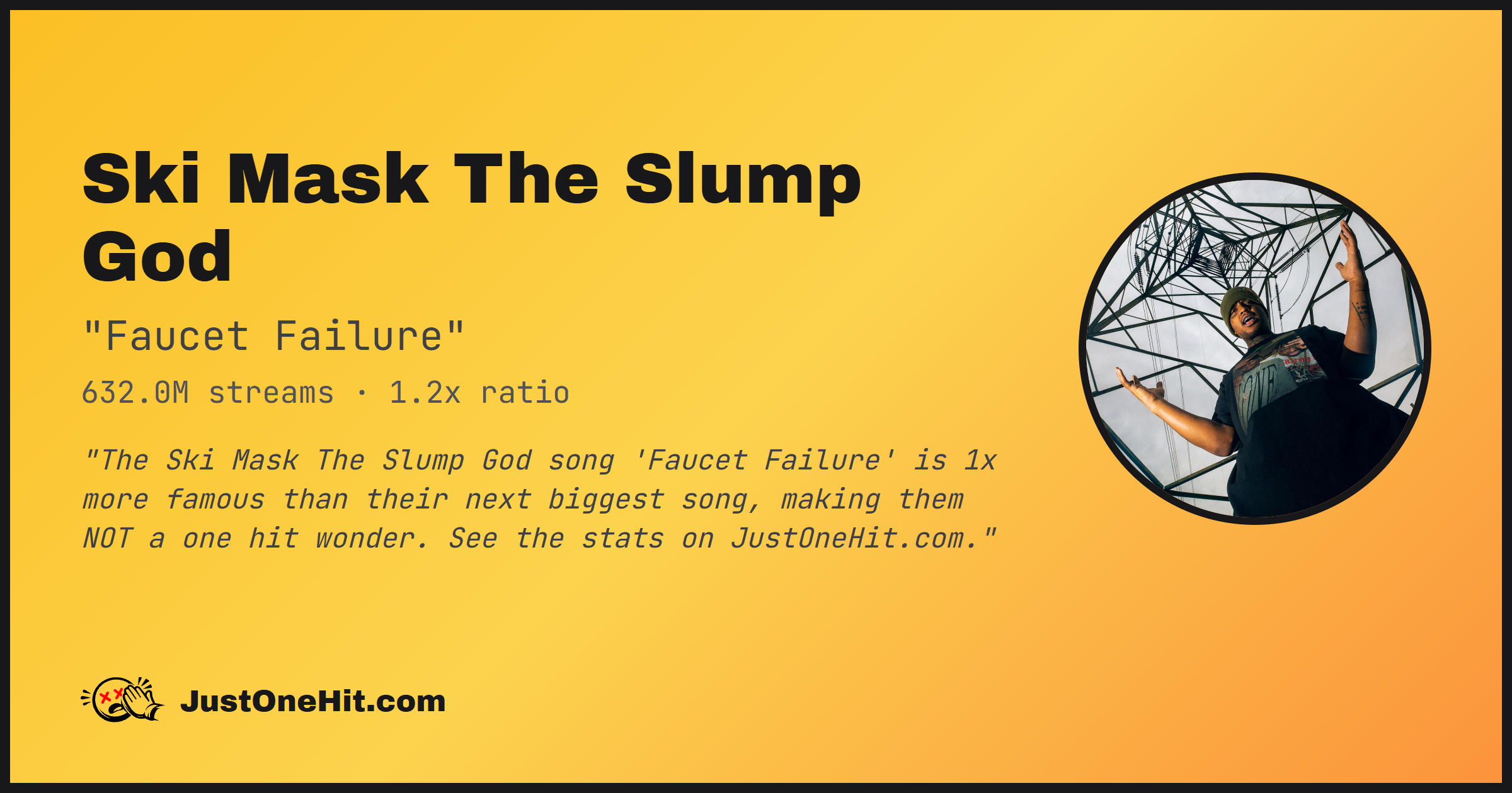 "The Ski Mask The Slump God song 'Faucet Failure' is 1x more famous than their next biggest song, making them NOT a one hit wonder. See the stats on JustOneHit.com."