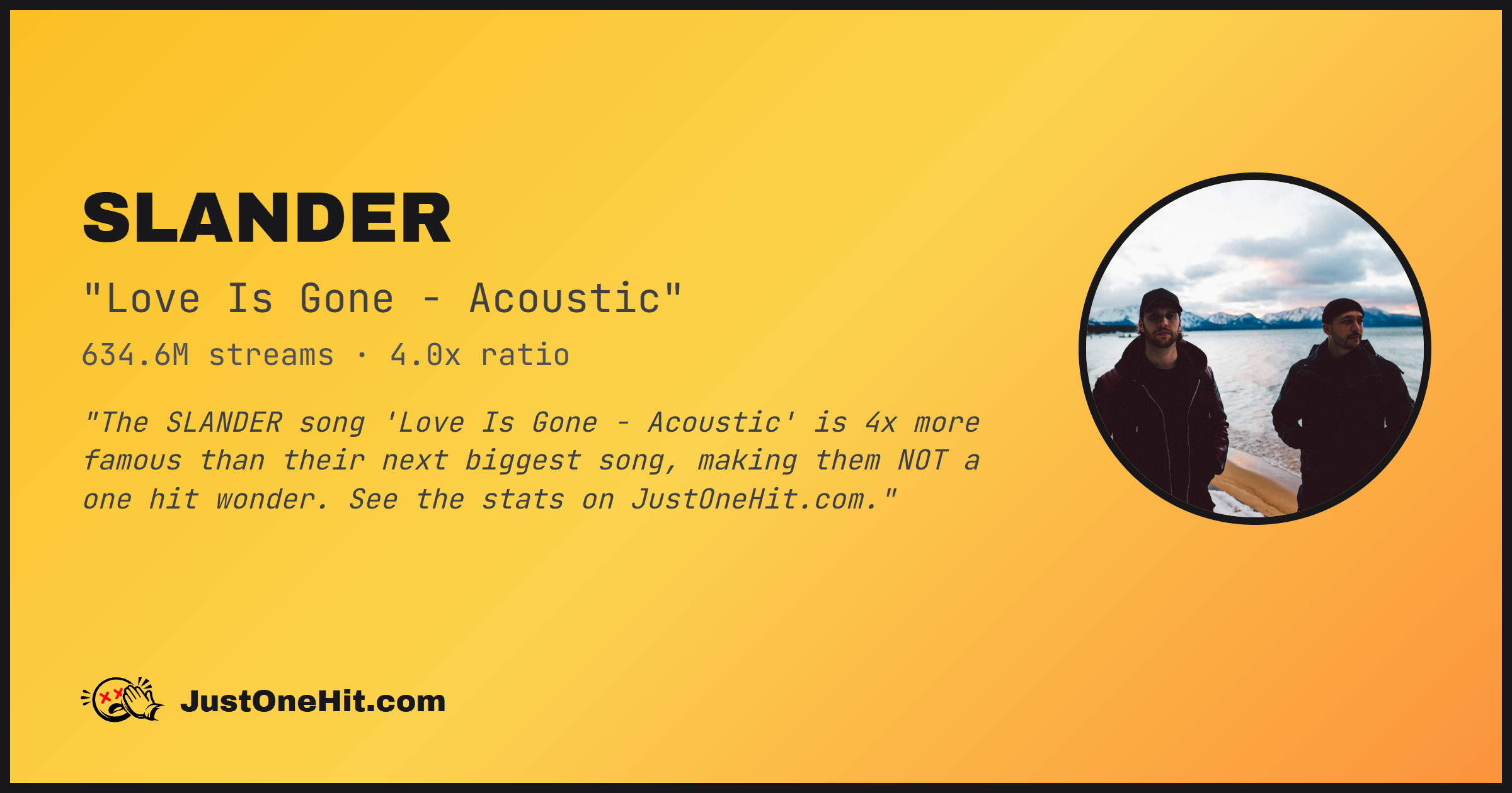 "The SLANDER song 'Love Is Gone - Acoustic' is 4x more famous than their next biggest song, making them NOT a one hit wonder. See the stats on JustOneHit.com."