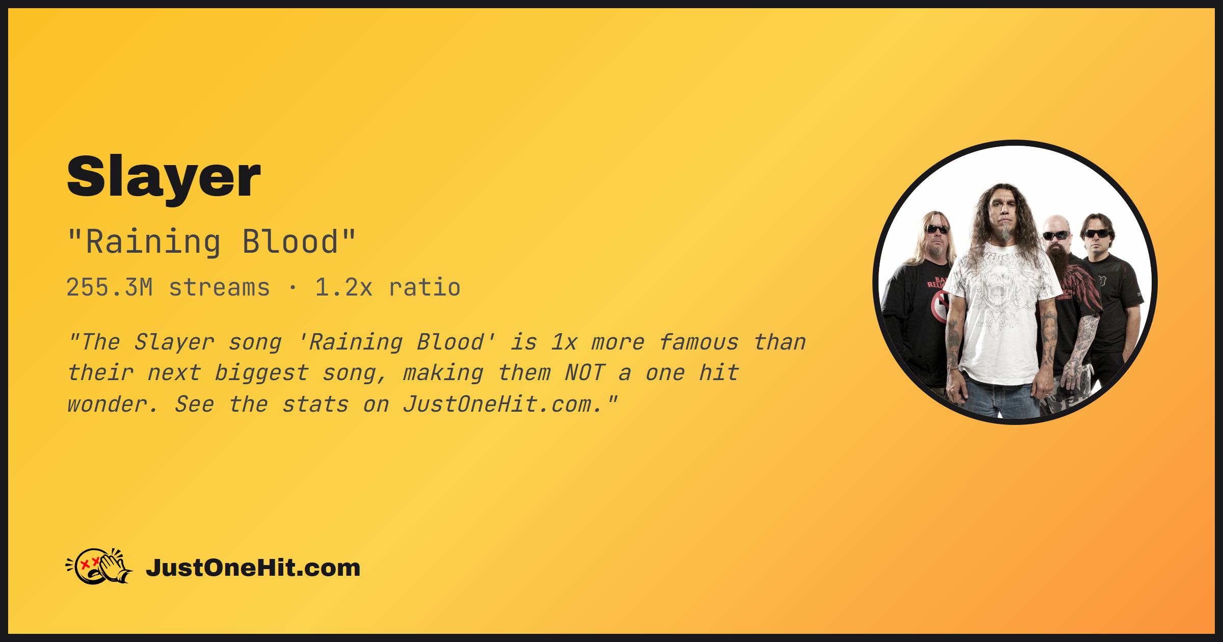 "The Slayer song 'Raining Blood' is 1x more famous than their next biggest song, making them NOT a one hit wonder. See the stats on JustOneHit.com."