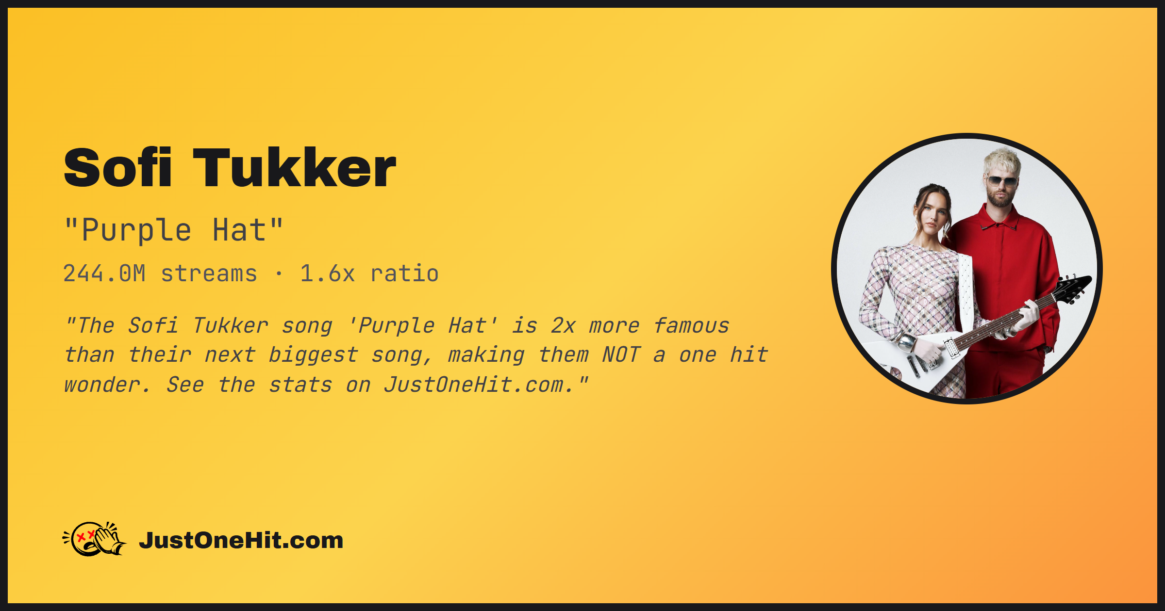 "The SOFI TUKKER song 'Purple Hat' is 2x more famous than their next biggest song, making them NOT a one hit wonder. See the stats on JustOneHit.com."
