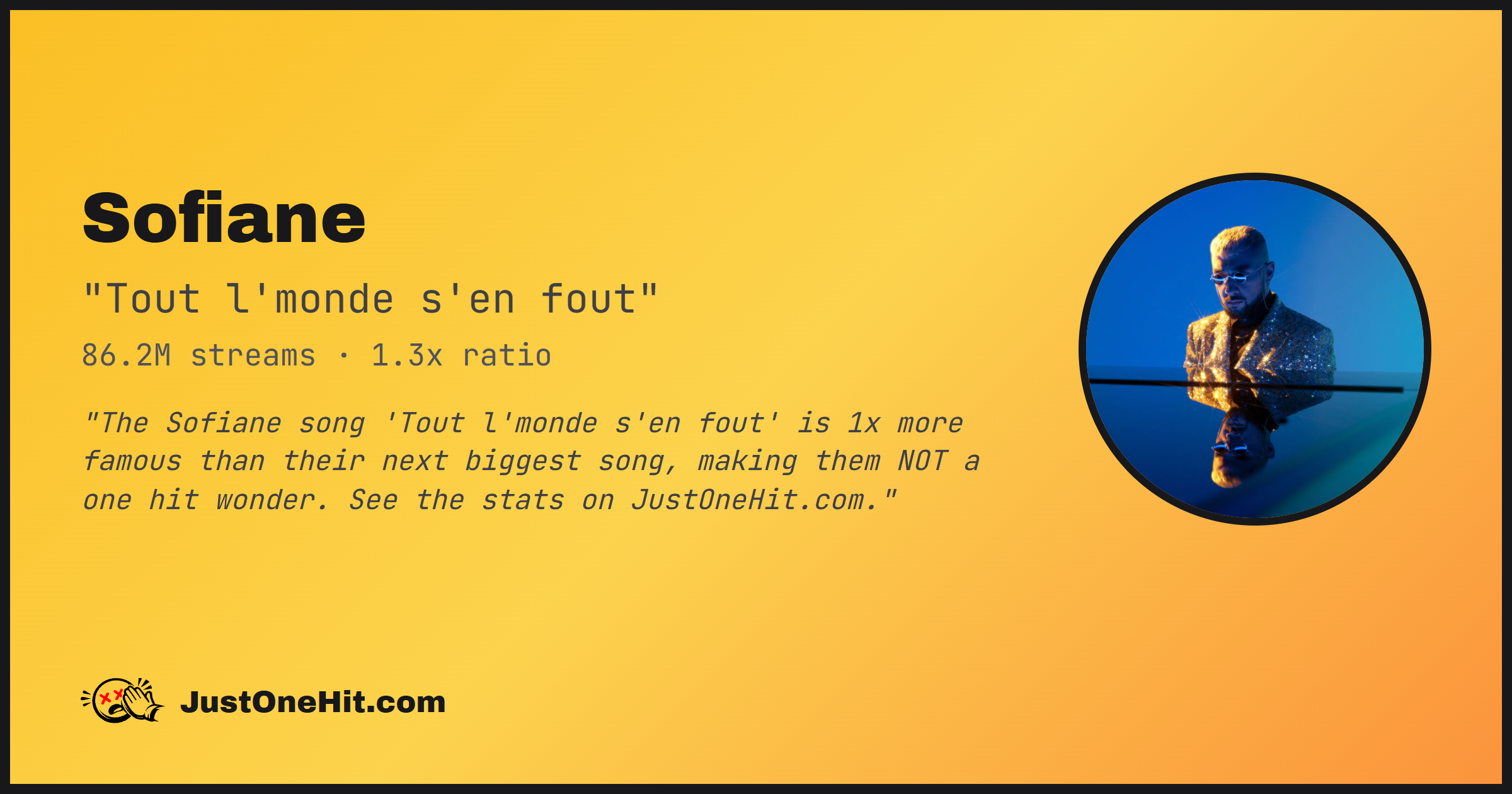 "The Sofiane song 'Tout l'monde s'en fout' is 1x more famous than their next biggest song, making them NOT a one hit wonder. See the stats on JustOneHit.com."