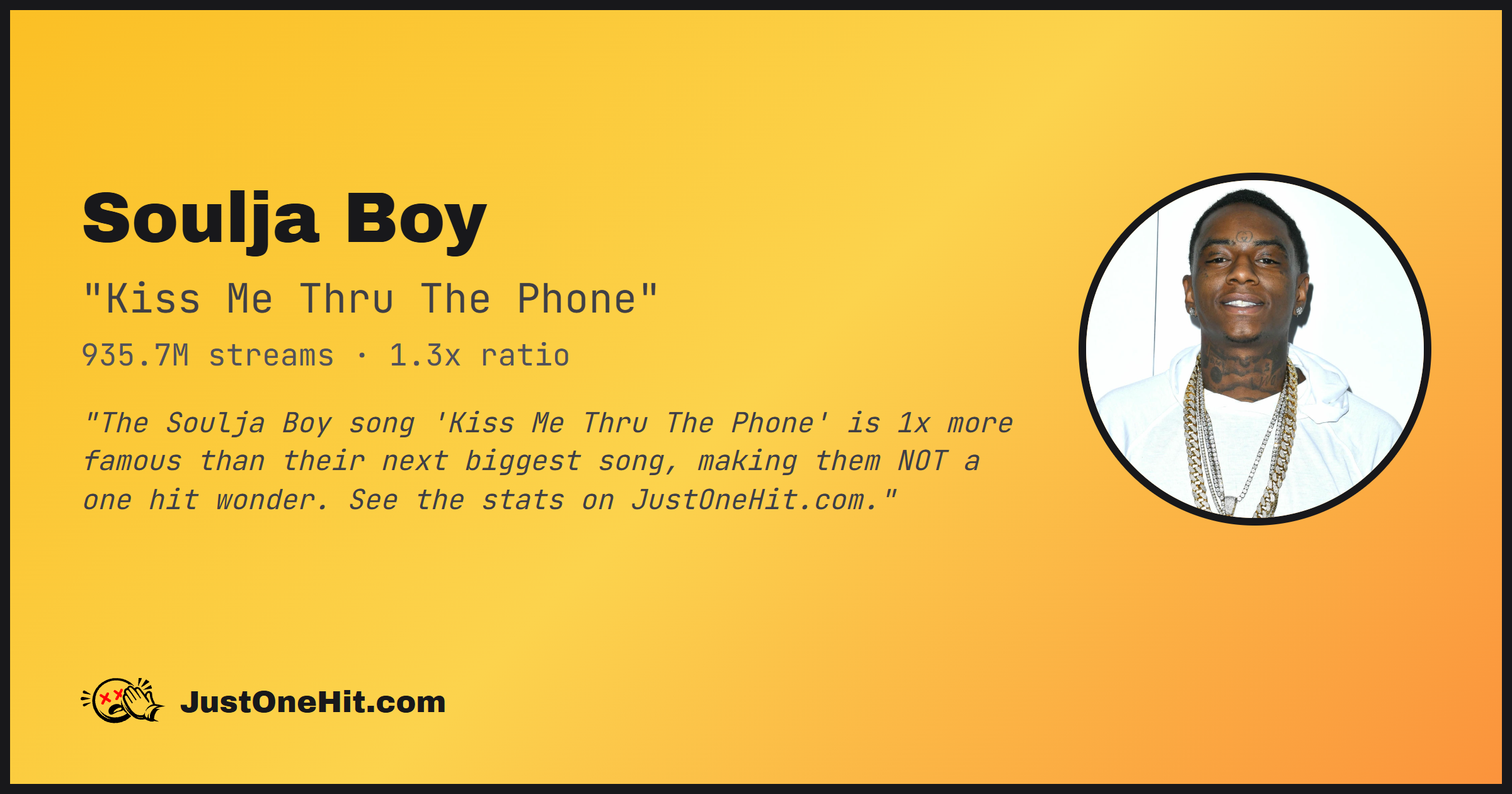 "The Soulja Boy song 'Kiss Me Thru The Phone' is 1x more famous than their next biggest song, making them NOT a one hit wonder. See the stats on JustOneHit.com."