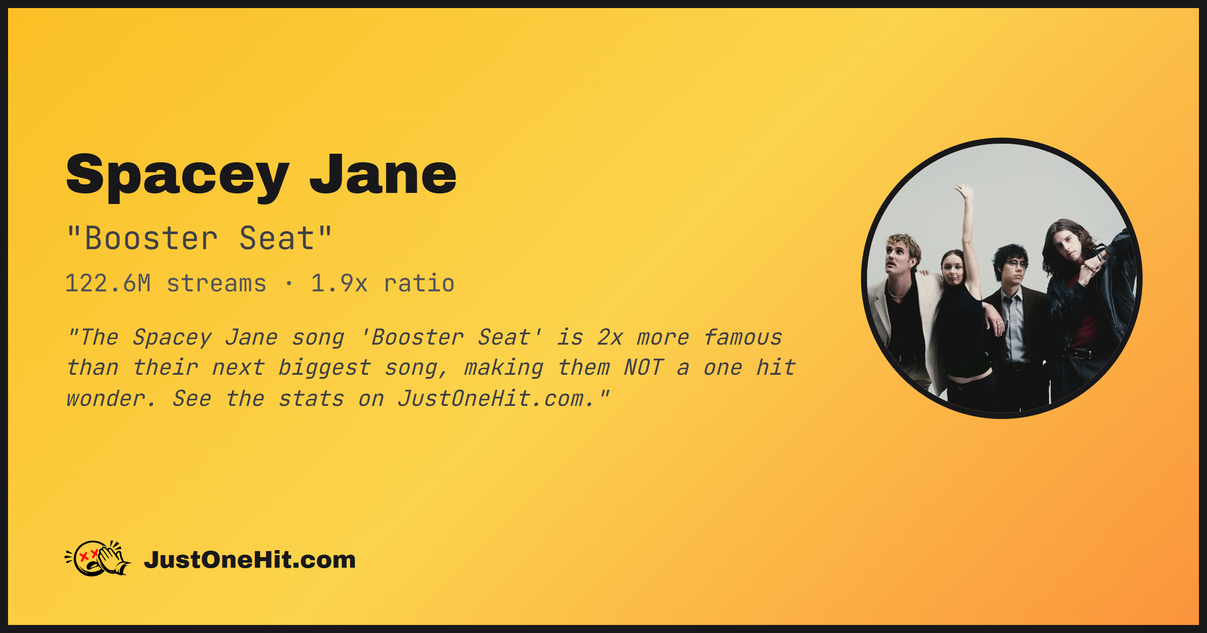 "The Spacey Jane song 'Booster Seat' is 2x more famous than their next biggest song, making them NOT a one hit wonder. See the stats on JustOneHit.com."