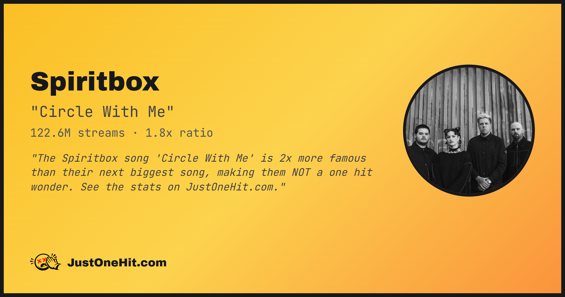 "The Spiritbox song 'Circle With Me' is 2x more famous than their next biggest song, making them NOT a one hit wonder. See the stats on JustOneHit.com."