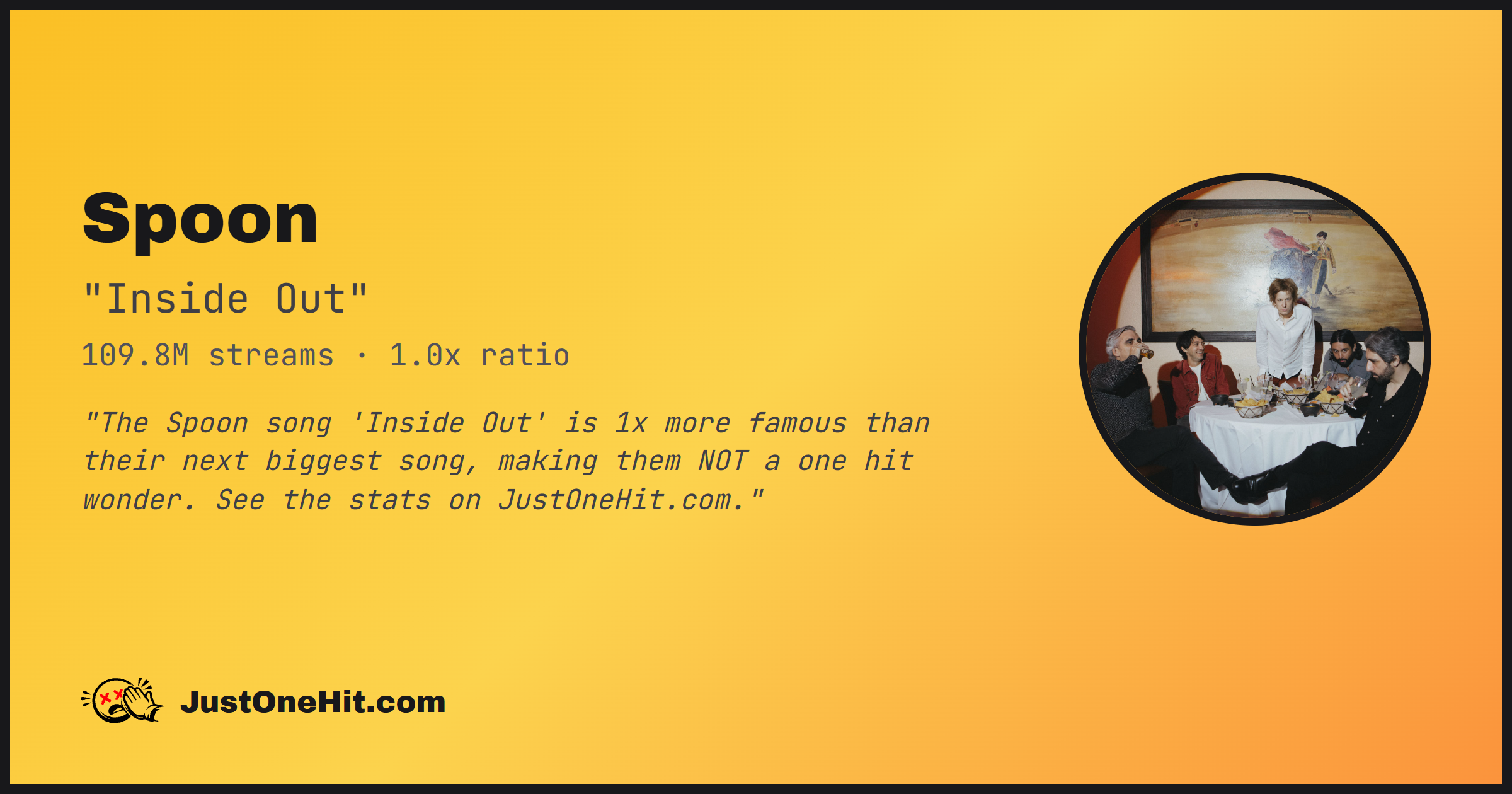 "The Spoon song 'Inside Out' is 1x more famous than their next biggest song, making them NOT a one hit wonder. See the stats on JustOneHit.com."
