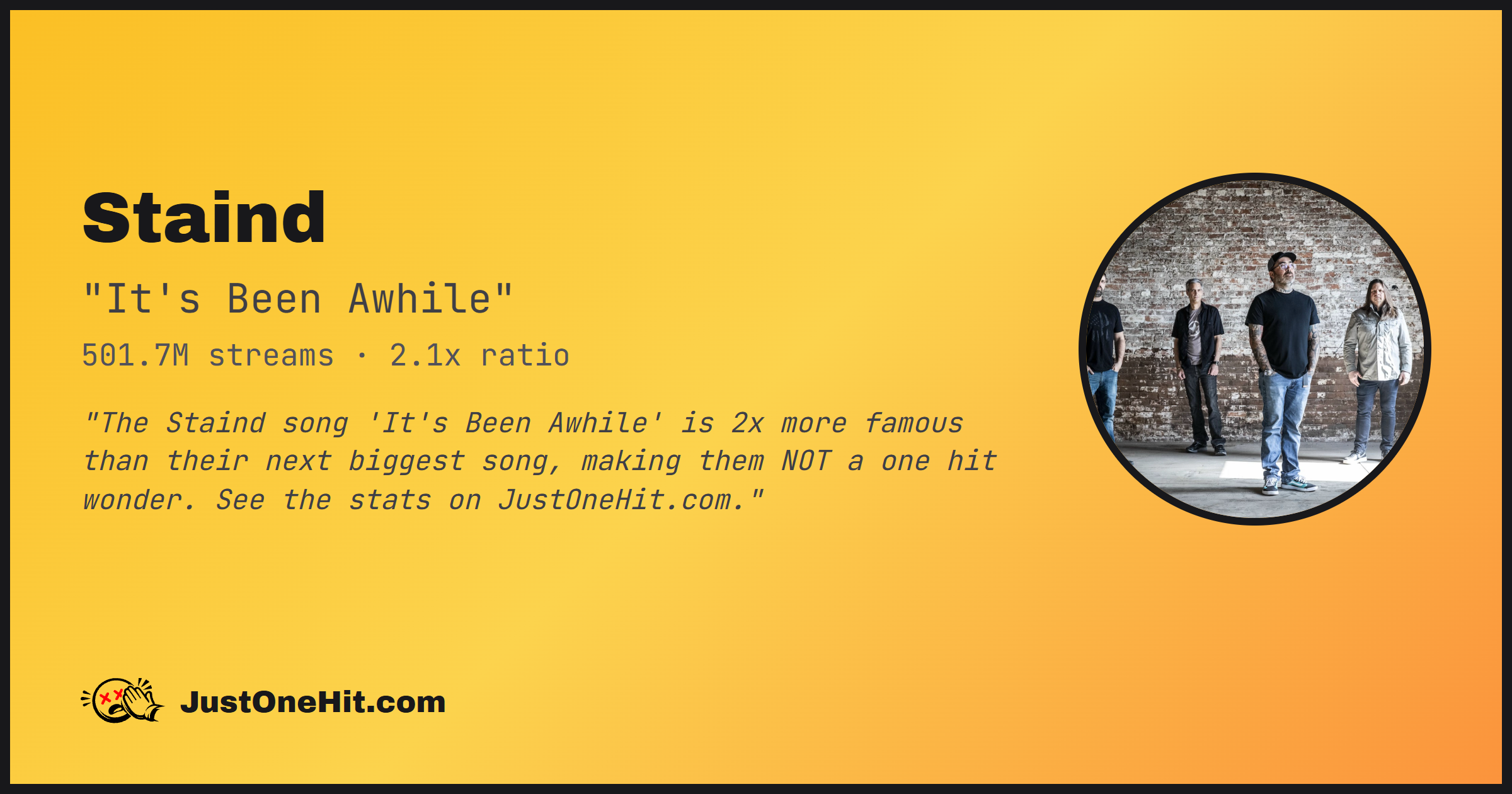 "The Staind song 'It's Been Awhile' is 2x more famous than their next biggest song, making them NOT a one hit wonder. See the stats on JustOneHit.com."
