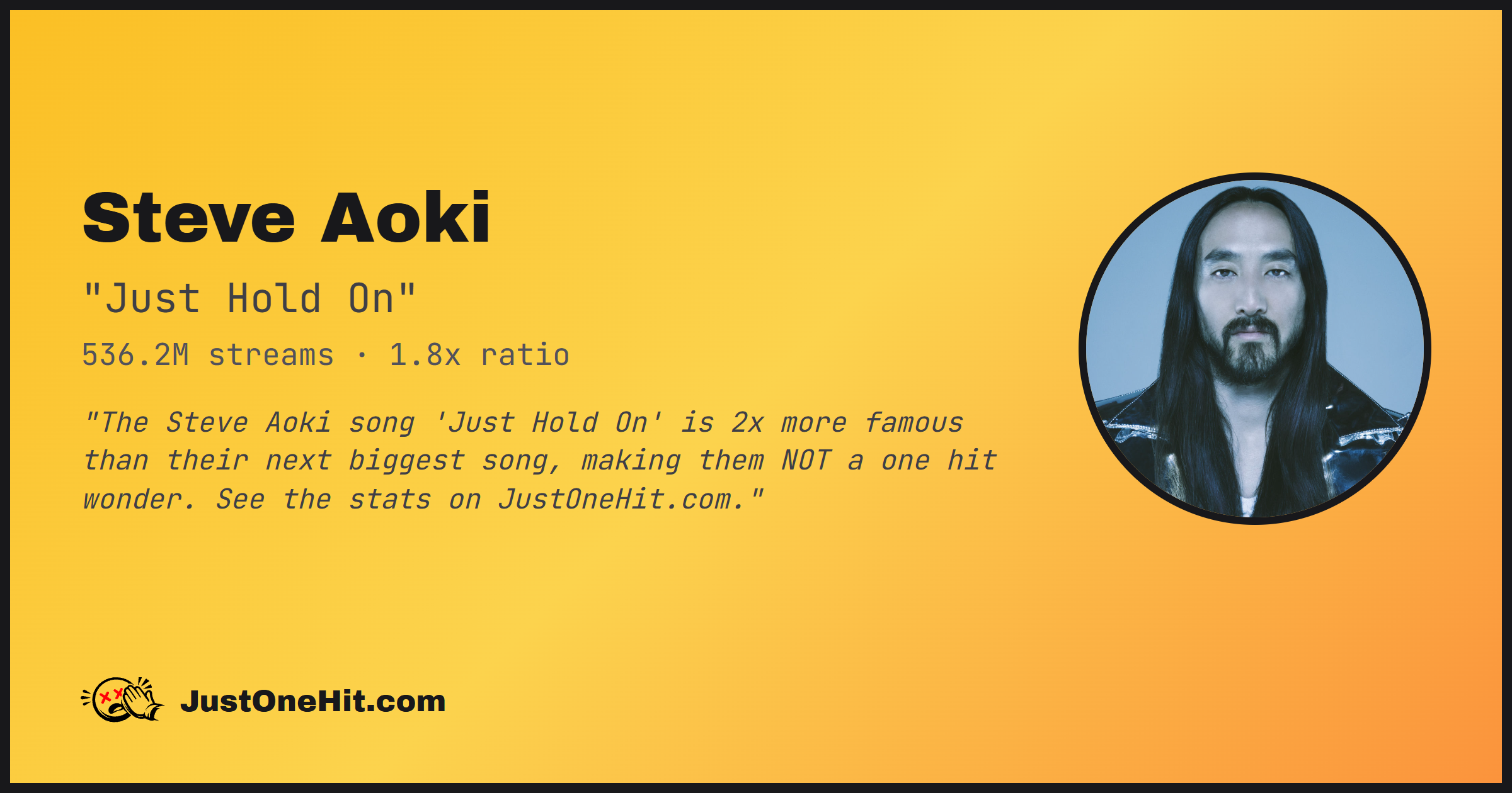 "The Steve Aoki song 'Just Hold On' is 2x more famous than their next biggest song, making them NOT a one hit wonder. See the stats on JustOneHit.com."