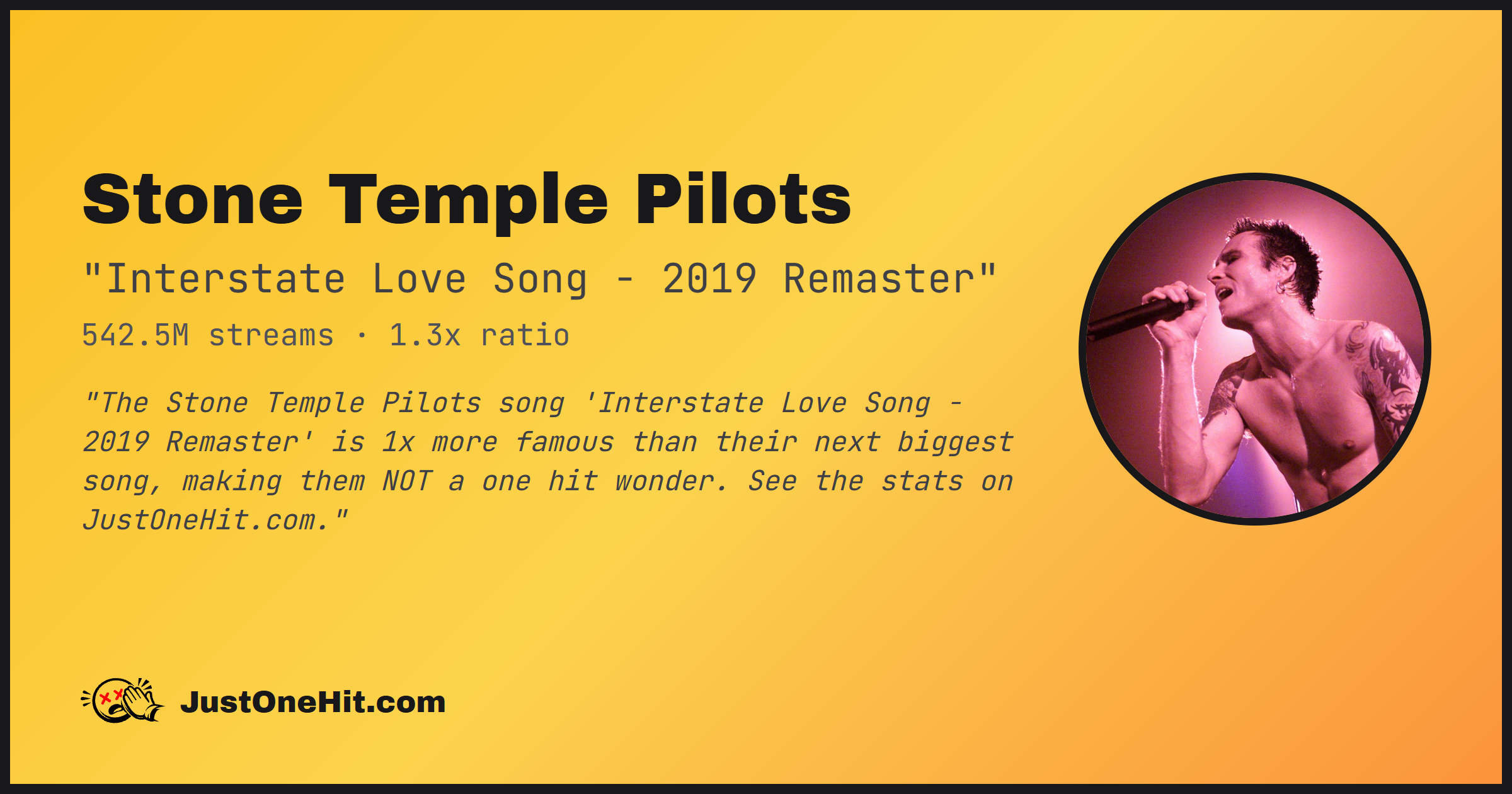 "The Stone Temple Pilots song 'Interstate Love Song - 2019 Remaster' is 1x more famous than their next biggest song, making them NOT a one hit wonder. See the stats on JustOneHit.com."