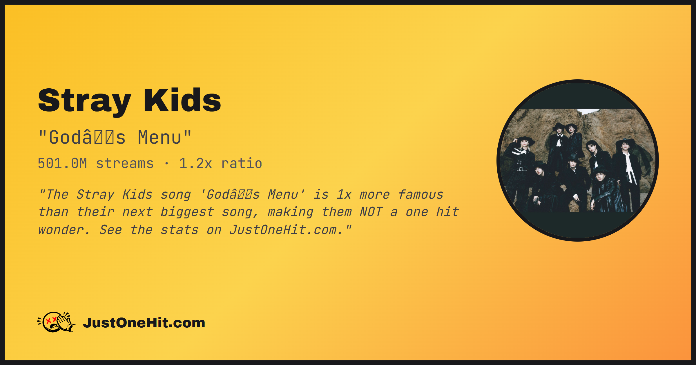 "The Stray Kids song 'Godâs Menu' is 1x more famous than their next biggest song, making them NOT a one hit wonder. See the stats on JustOneHit.com."
