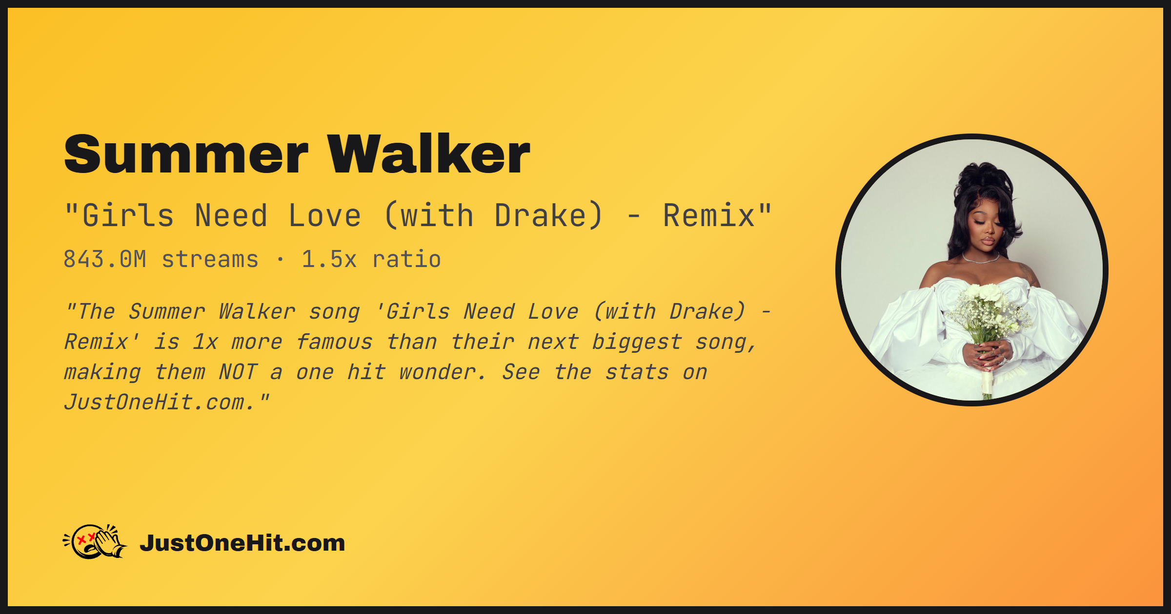 "The Summer Walker song 'Girls Need Love (with Drake) - Remix' is 1x more famous than their next biggest song, making them NOT a one hit wonder. See the stats on JustOneHit.com."