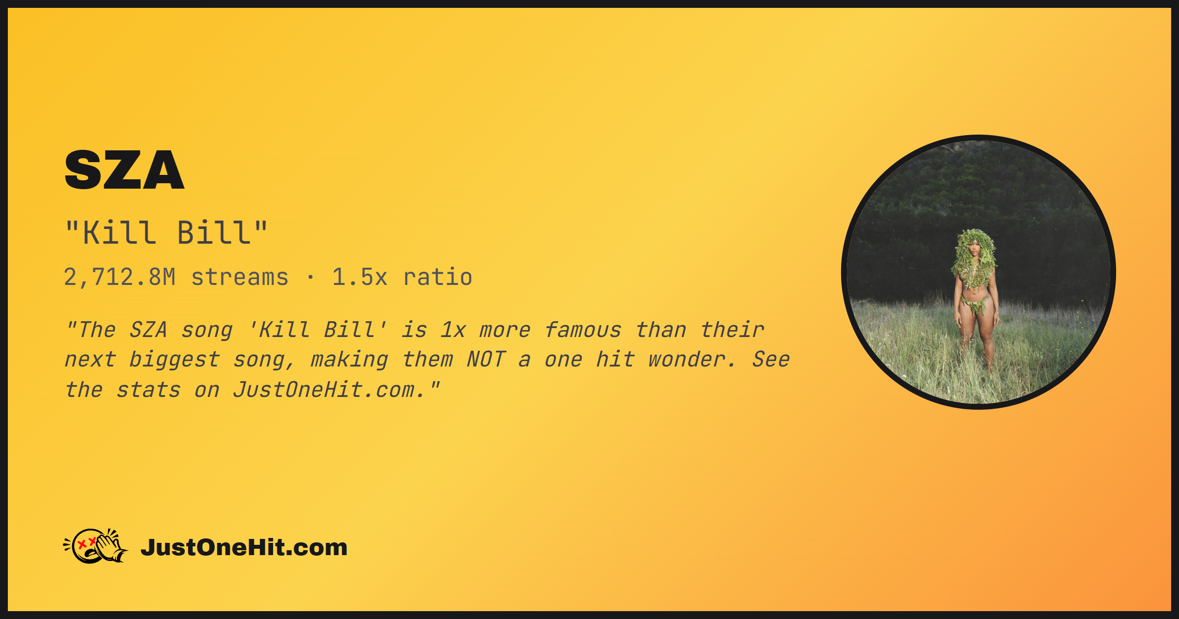 "The SZA song 'Kill Bill' is 1x more famous than their next biggest song, making them NOT a one hit wonder. See the stats on JustOneHit.com."