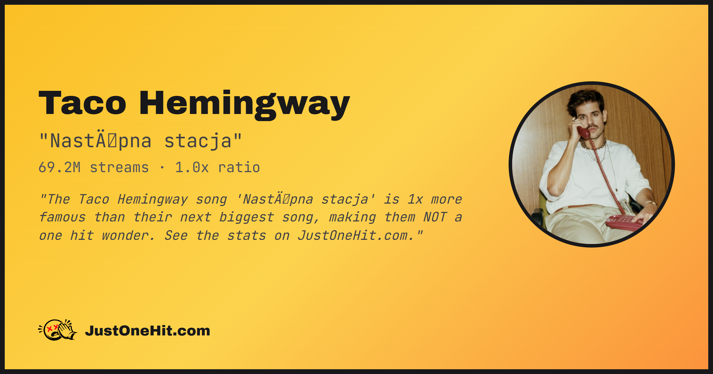 "The Taco Hemingway song 'NastÄpna stacja' is 1x more famous than their next biggest song, making them NOT a one hit wonder. See the stats on JustOneHit.com."