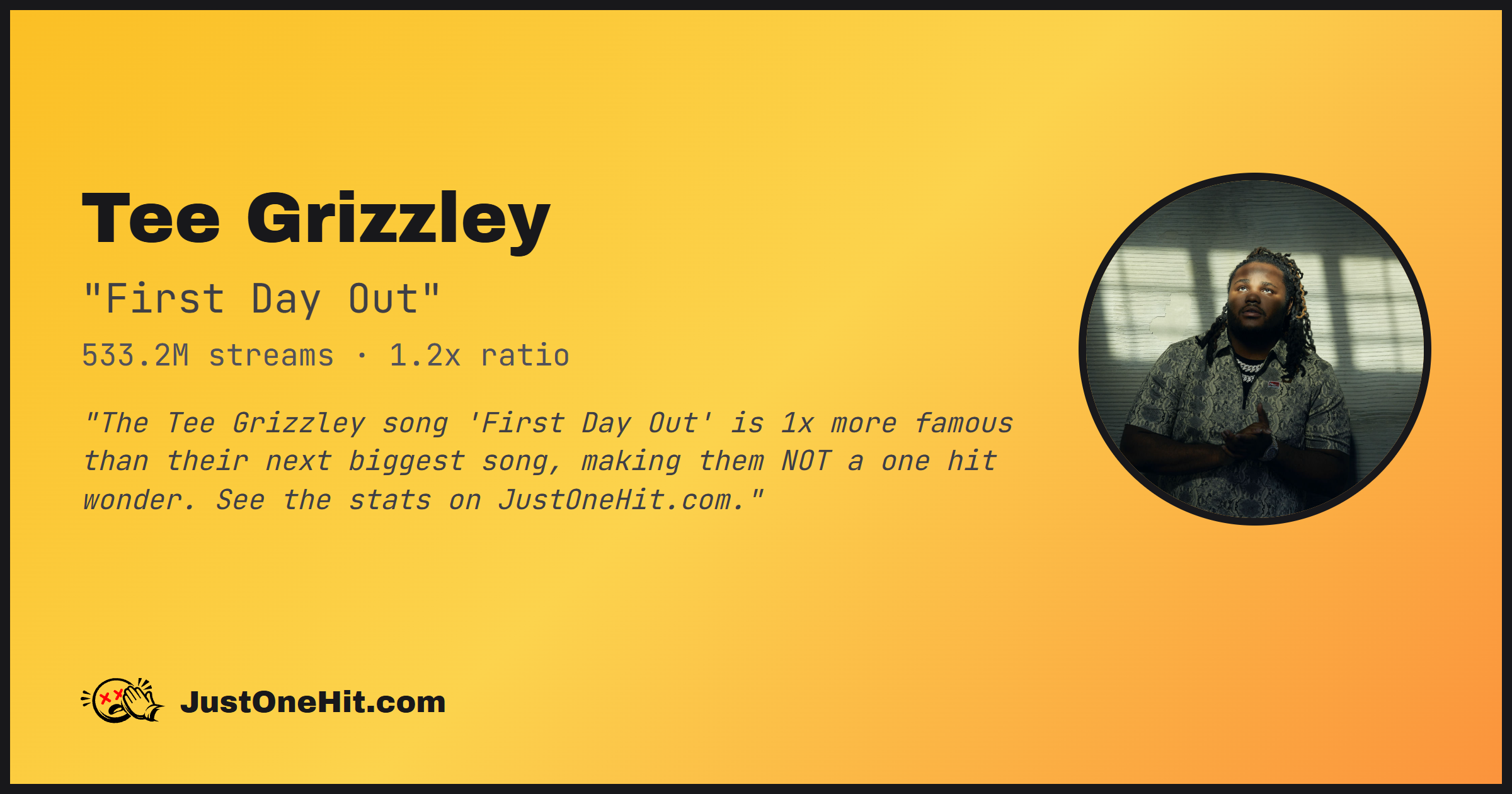 "The Tee Grizzley song 'First Day Out' is 1x more famous than their next biggest song, making them NOT a one hit wonder. See the stats on JustOneHit.com."