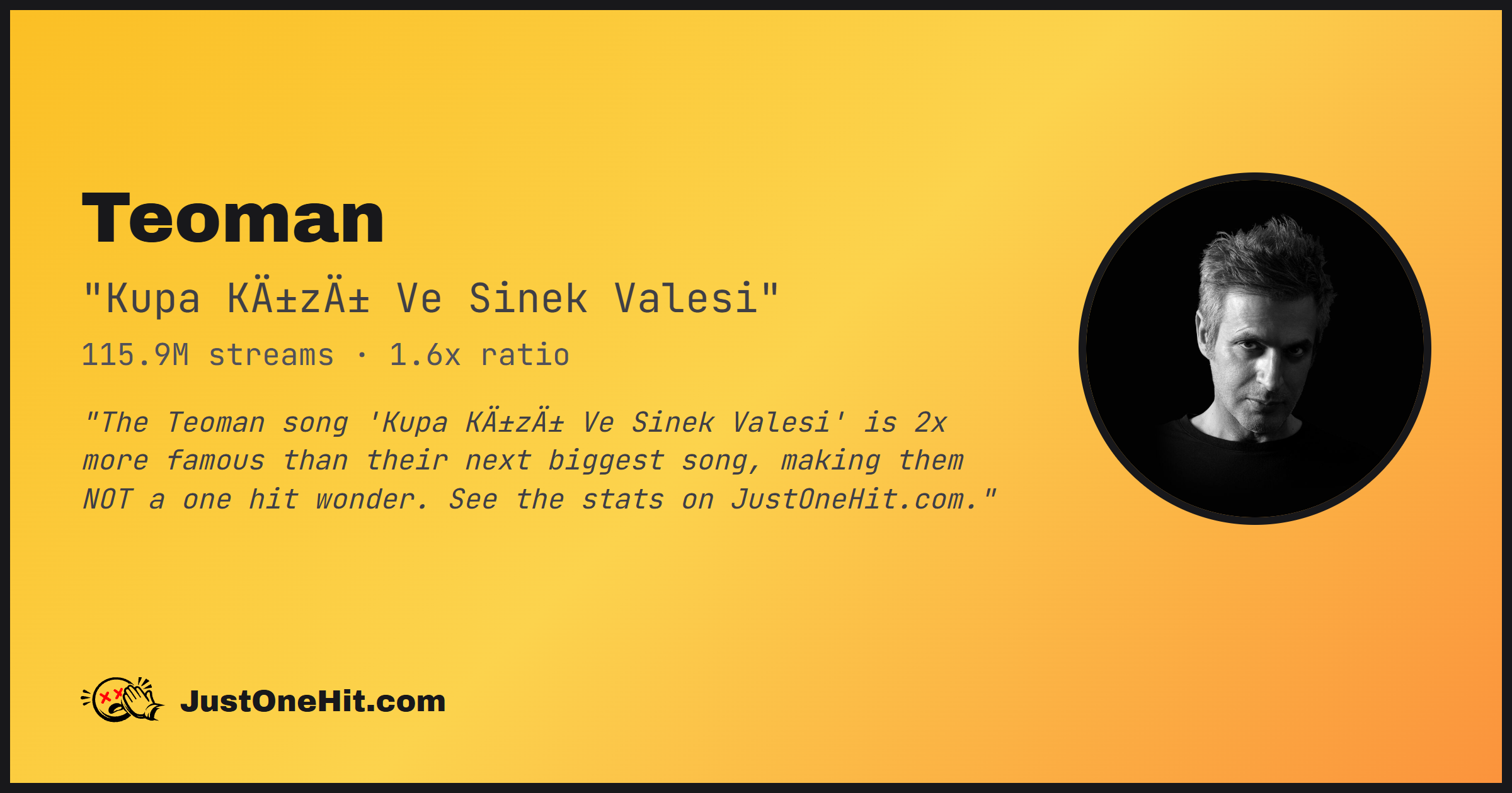 "The Teoman song 'Kupa Kızı Ve Sinek Valesi' is 2x more famous than their next biggest song, making them NOT a one hit wonder. See the stats on JustOneHit.com."