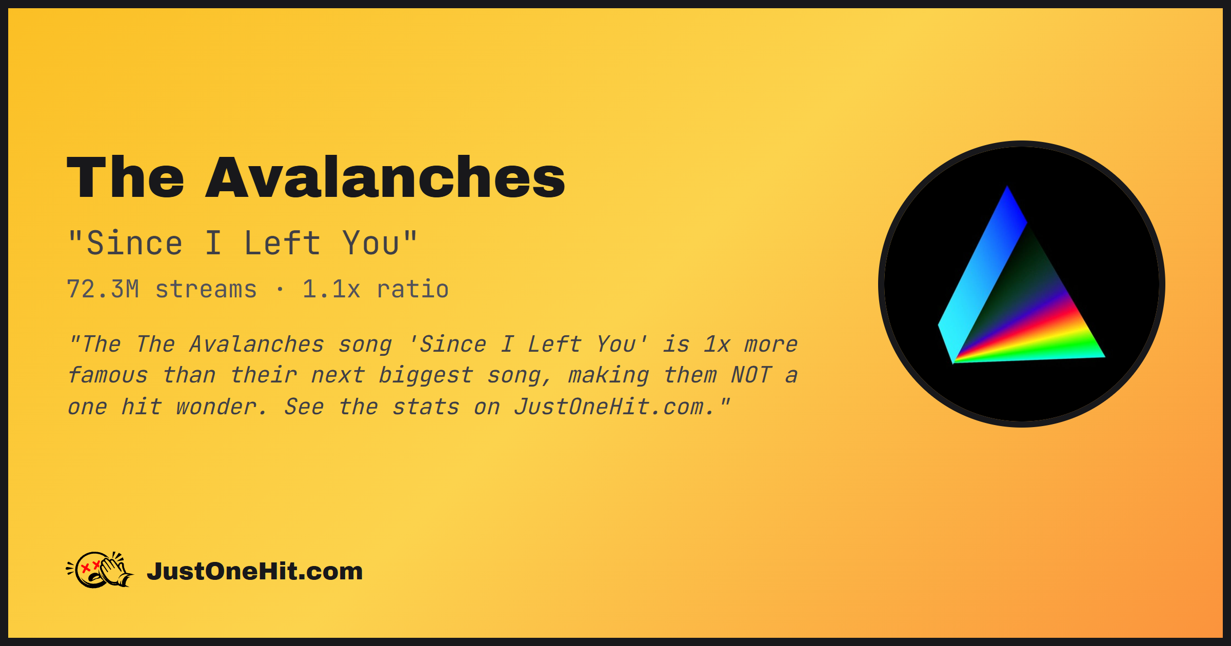 "The The Avalanches song 'Since I Left You' is 1x more famous than their next biggest song, making them NOT a one hit wonder. See the stats on JustOneHit.com."