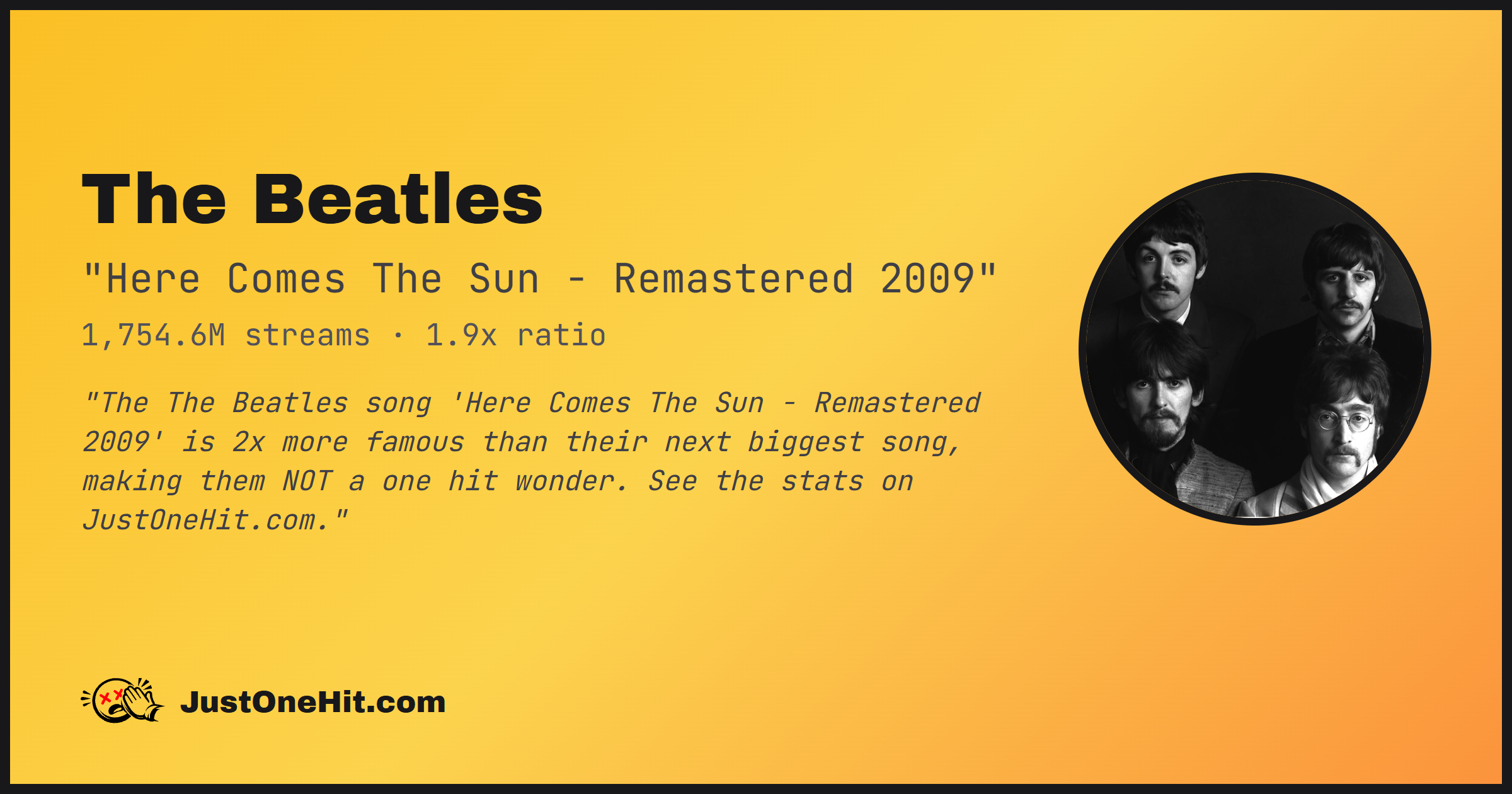 "The The Beatles song 'Here Comes The Sun - Remastered 2009' is 2x more famous than their next biggest song, making them NOT a one hit wonder. See the stats on JustOneHit.com."