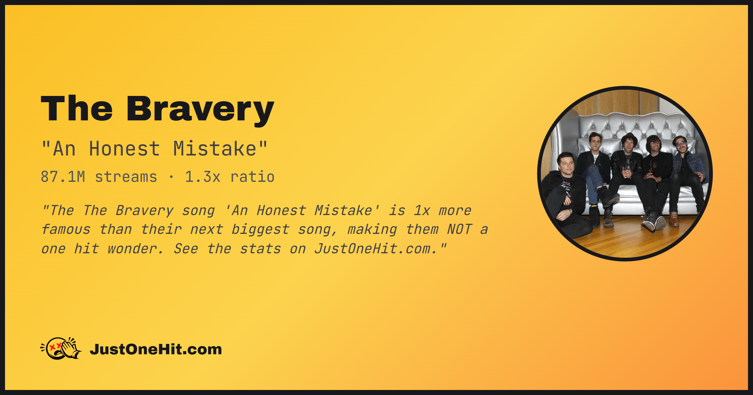 "The The Bravery song 'An Honest Mistake' is 1x more famous than their next biggest song, making them NOT a one hit wonder. See the stats on JustOneHit.com."