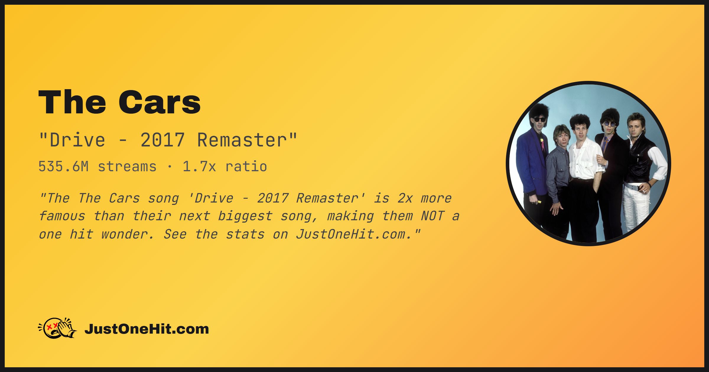 "The The Cars song 'Drive - 2017 Remaster' is 2x more famous than their next biggest song, making them NOT a one hit wonder. See the stats on JustOneHit.com."