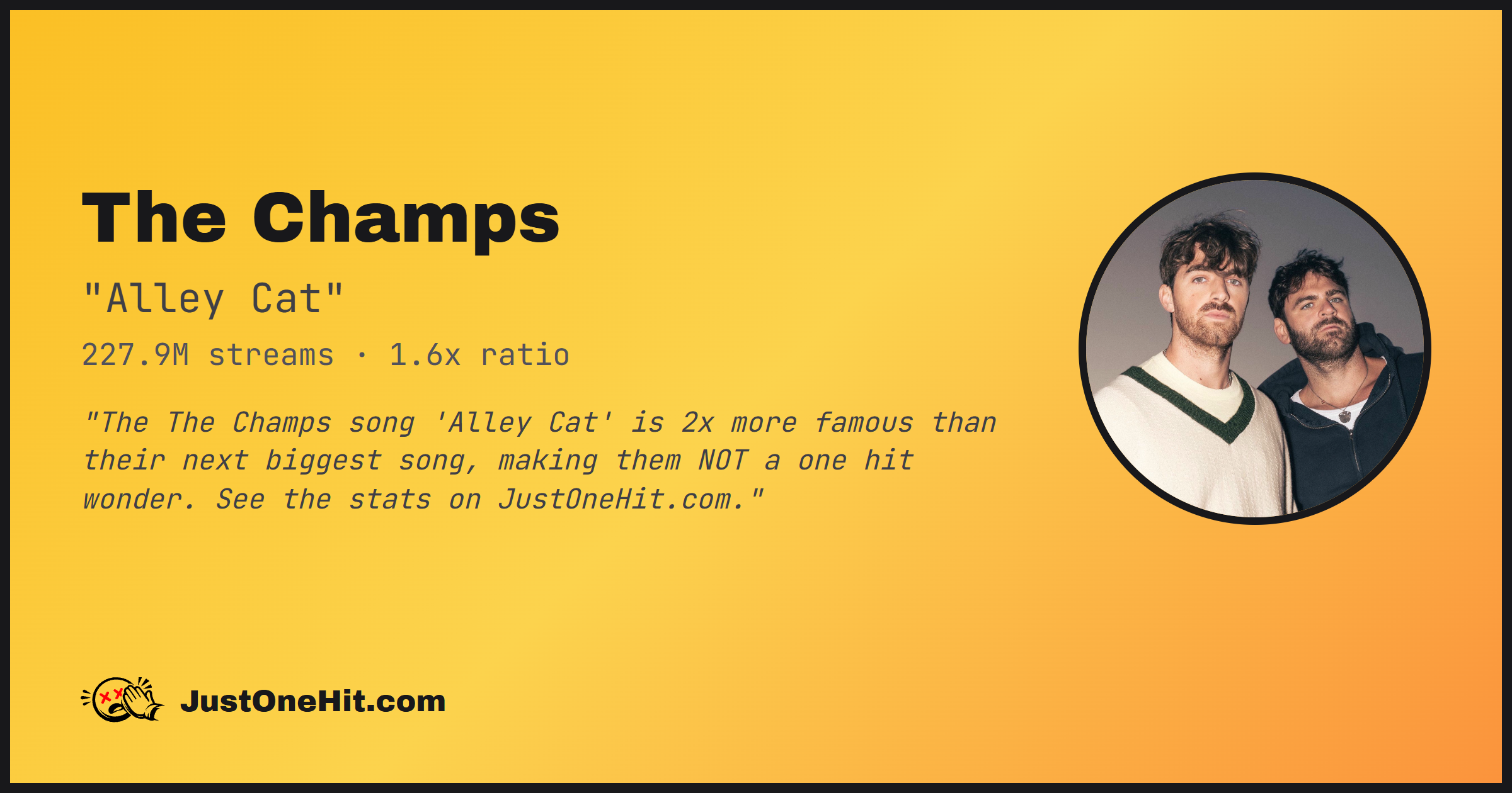 "The The Champs song 'Alley Cat' is 2x more famous than their next biggest song, making them NOT a one hit wonder. See the stats on JustOneHit.com."