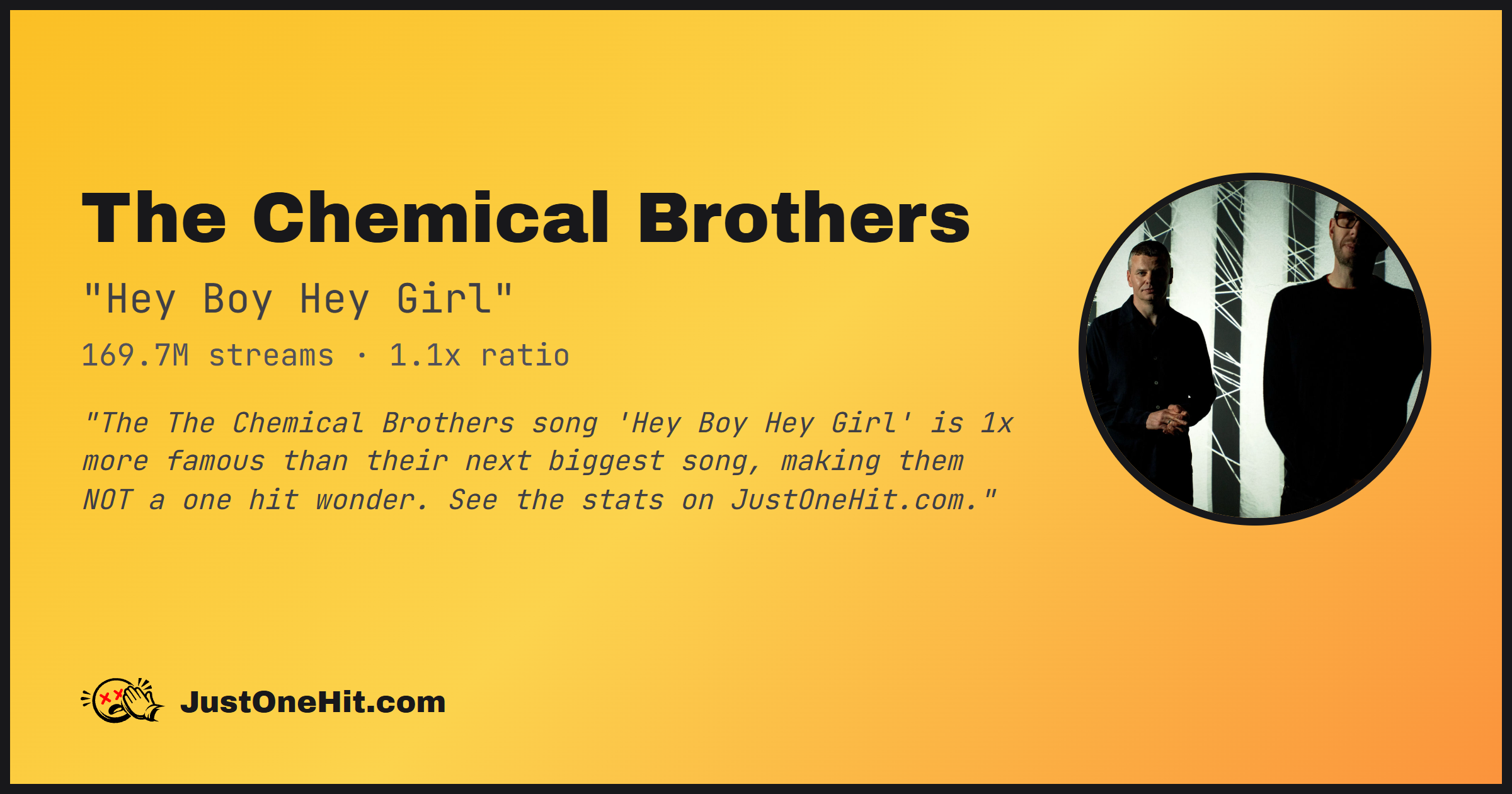 "The The Chemical Brothers song 'Hey Boy Hey Girl' is 1x more famous than their next biggest song, making them NOT a one hit wonder. See the stats on JustOneHit.com."