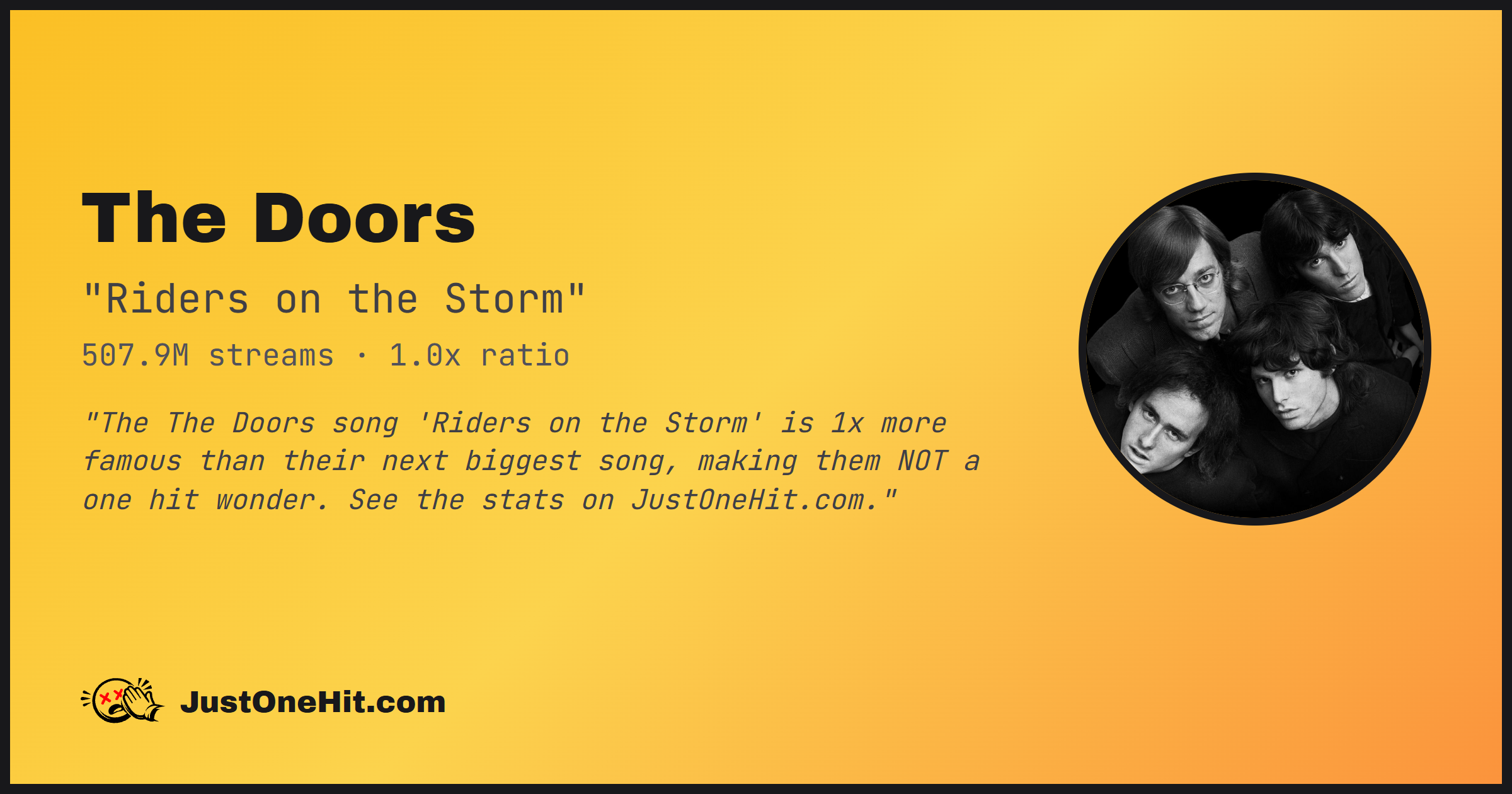 "The The Doors song 'Riders on the Storm' is 1x more famous than their next biggest song, making them NOT a one hit wonder. See the stats on JustOneHit.com."