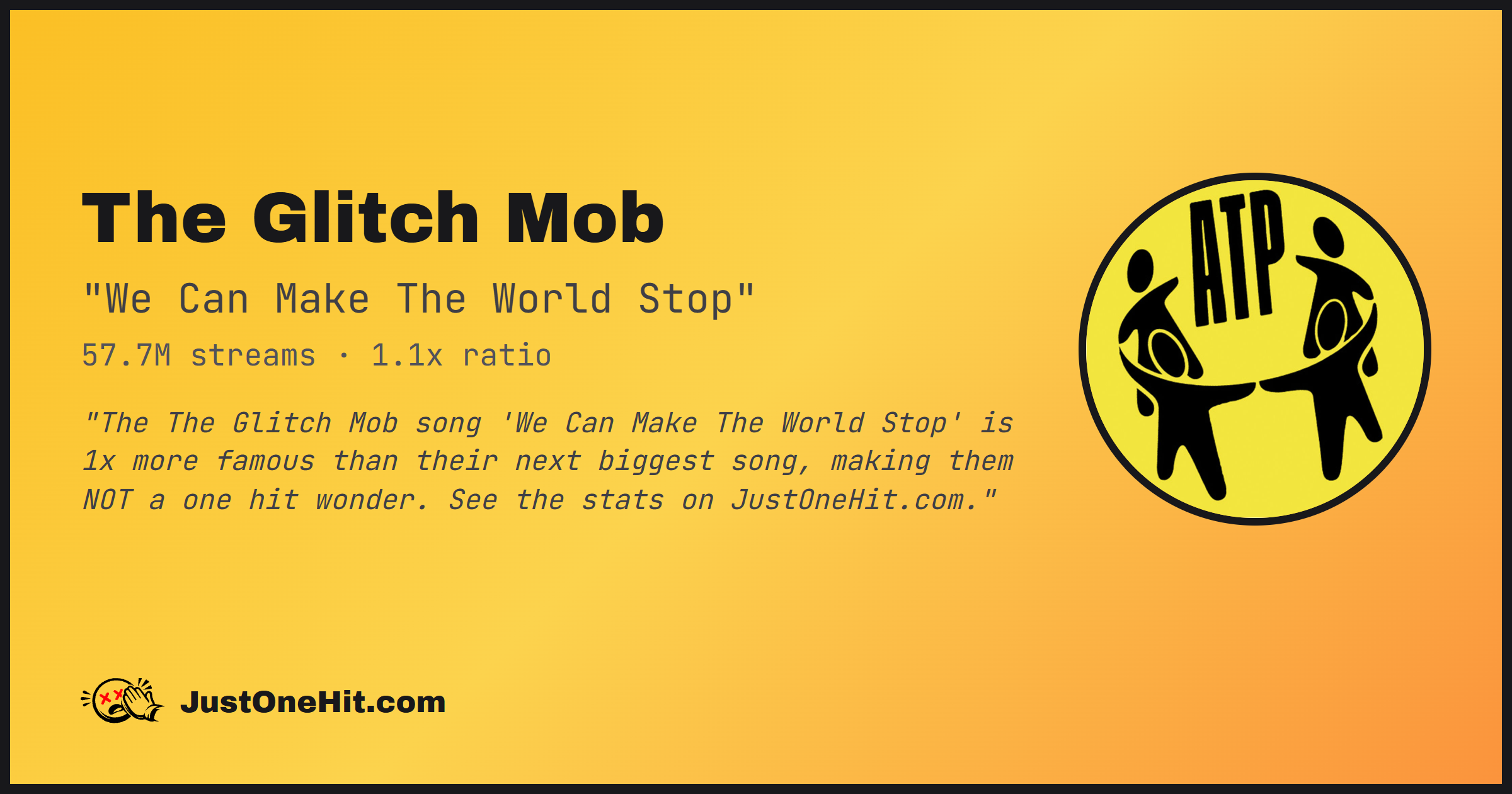 "The The Glitch Mob song 'We Can Make The World Stop' is 1x more famous than their next biggest song, making them NOT a one hit wonder. See the stats on JustOneHit.com."