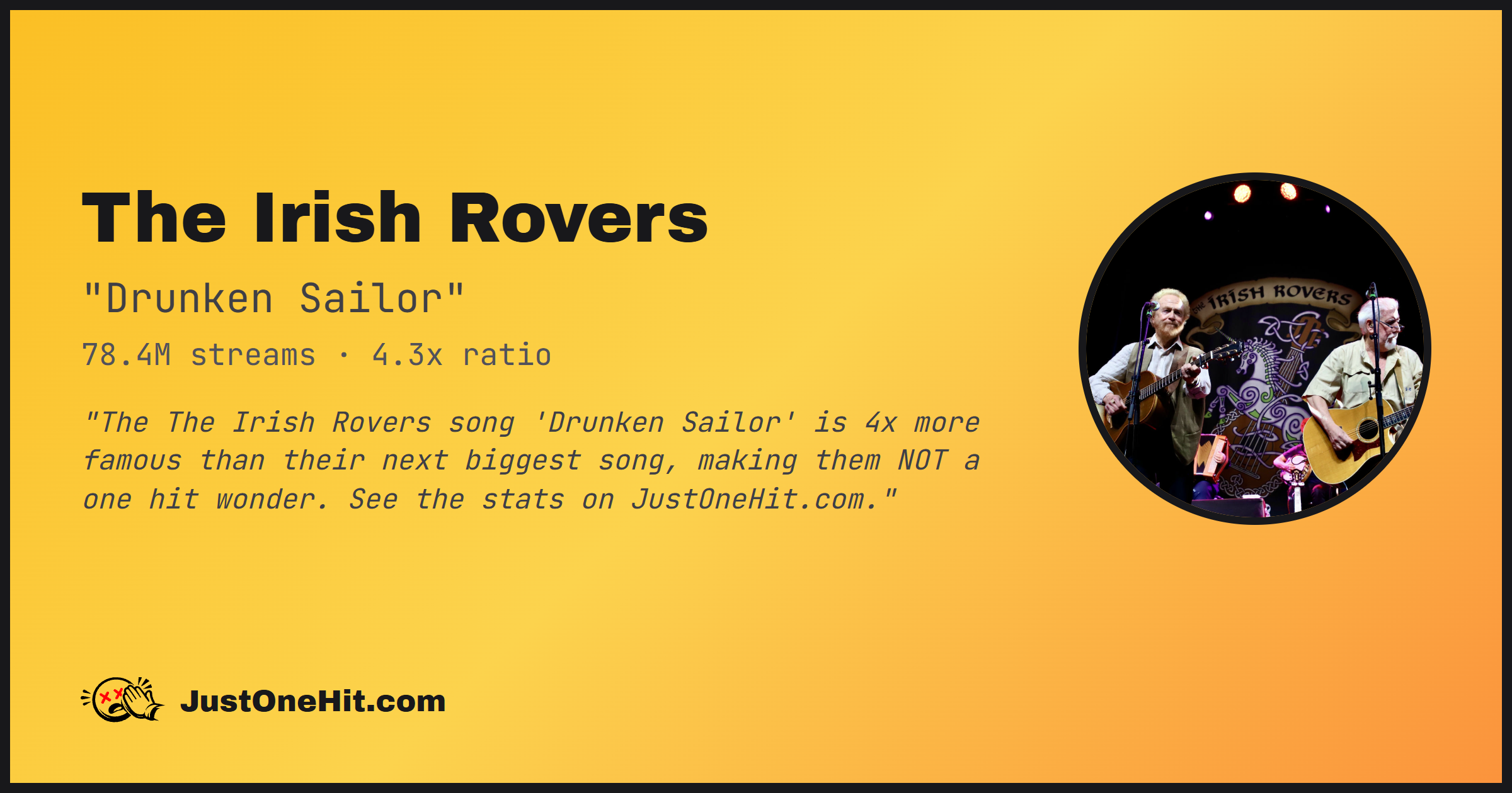 "The The Irish Rovers song 'Drunken Sailor' is 4x more famous than their next biggest song, making them NOT a one hit wonder. See the stats on JustOneHit.com."