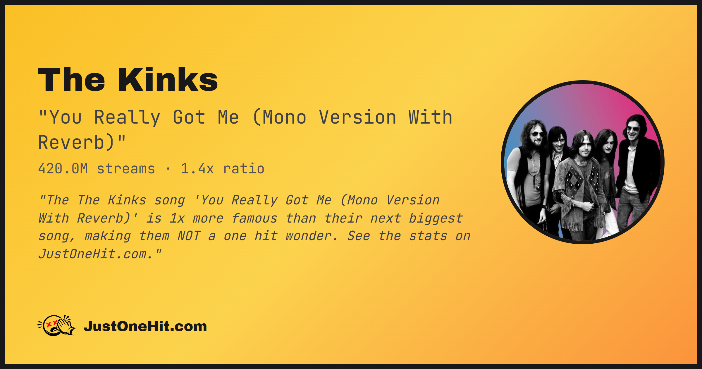 "The The Kinks song 'You Really Got Me (Mono Version With Reverb)' is 1x more famous than their next biggest song, making them NOT a one hit wonder. See the stats on JustOneHit.com."