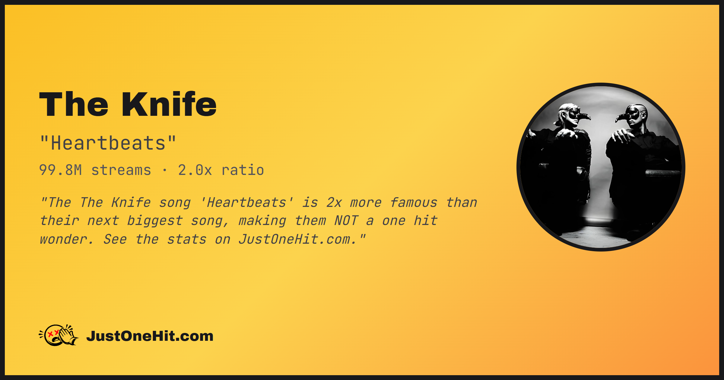 "The The Knife song 'Heartbeats' is 2x more famous than their next biggest song, making them NOT a one hit wonder. See the stats on JustOneHit.com."