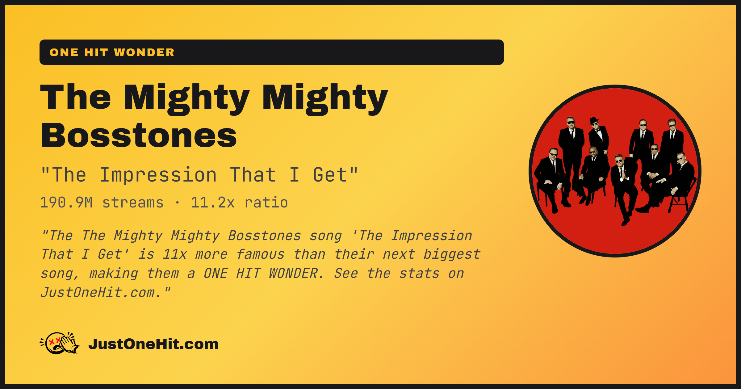 "The The Mighty Mighty Bosstones song 'The Impression That I Get' is 11x more famous than their next biggest song, making them a ONE HIT WONDER. See the stats on JustOneHit.com."
