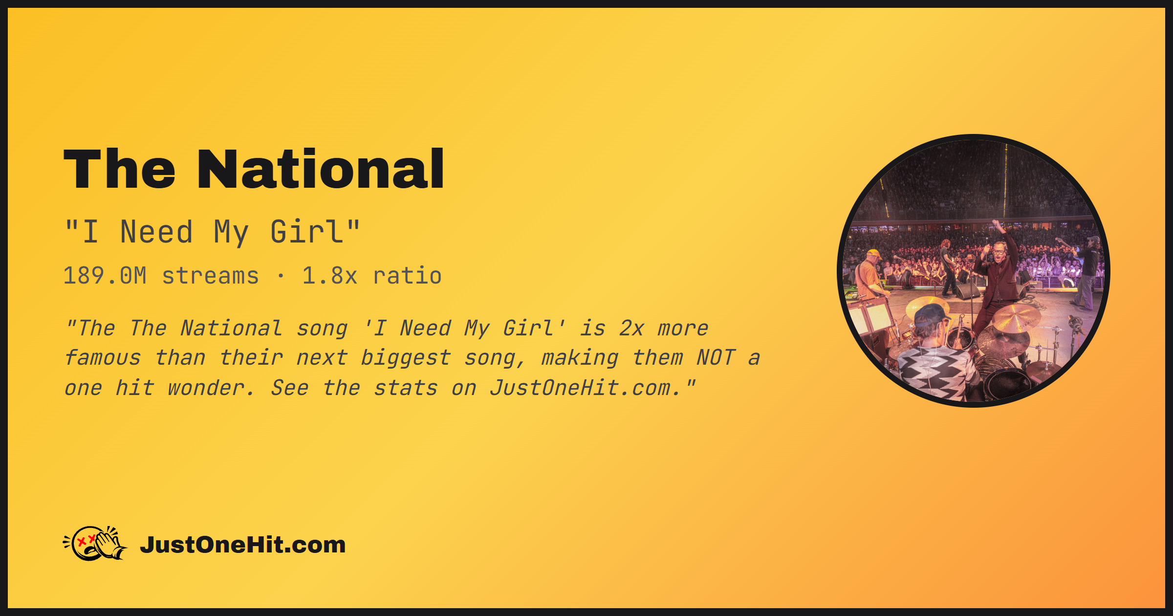 "The The National song 'I Need My Girl' is 2x more famous than their next biggest song, making them NOT a one hit wonder. See the stats on JustOneHit.com."