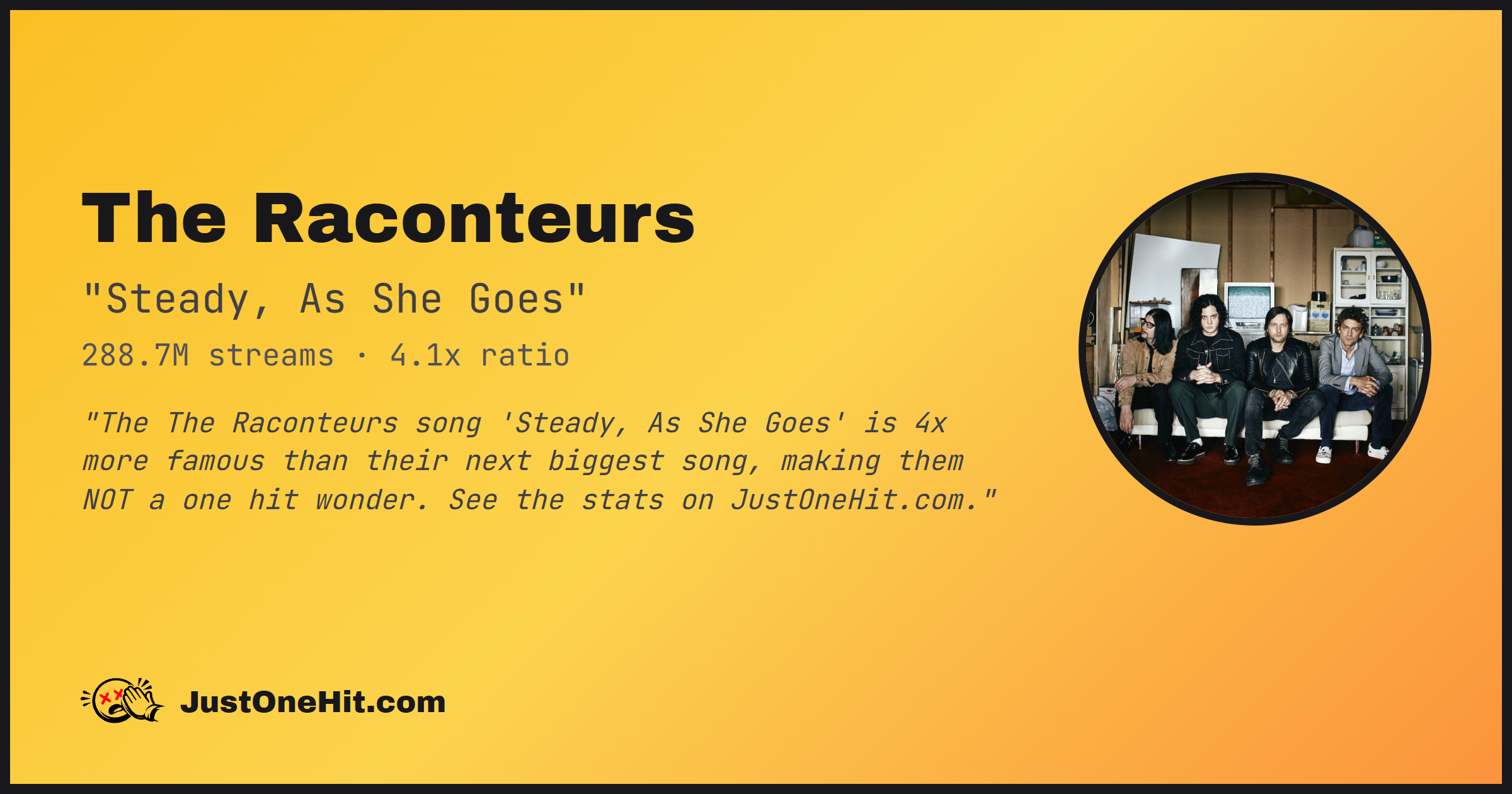 "The The Raconteurs song 'Steady, As She Goes' is 4x more famous than their next biggest song, making them NOT a one hit wonder. See the stats on JustOneHit.com."